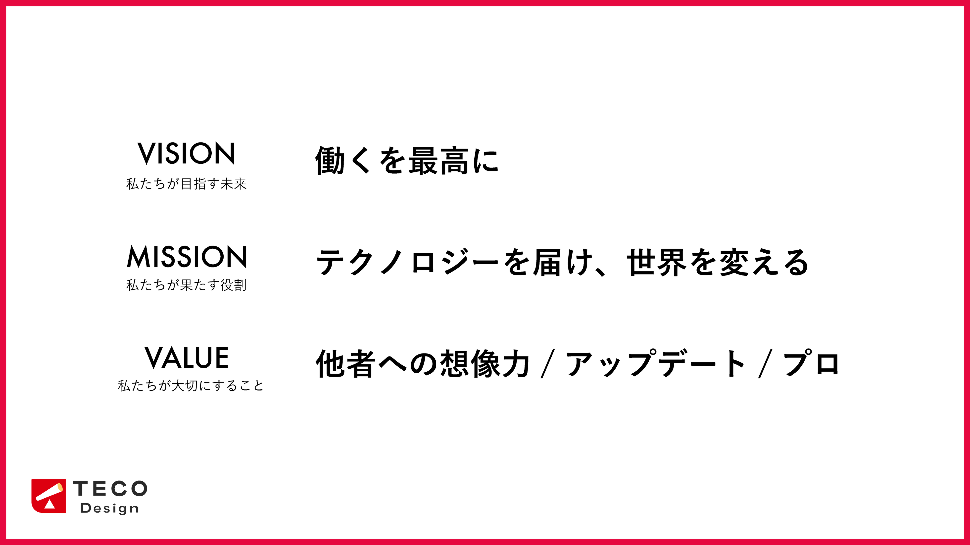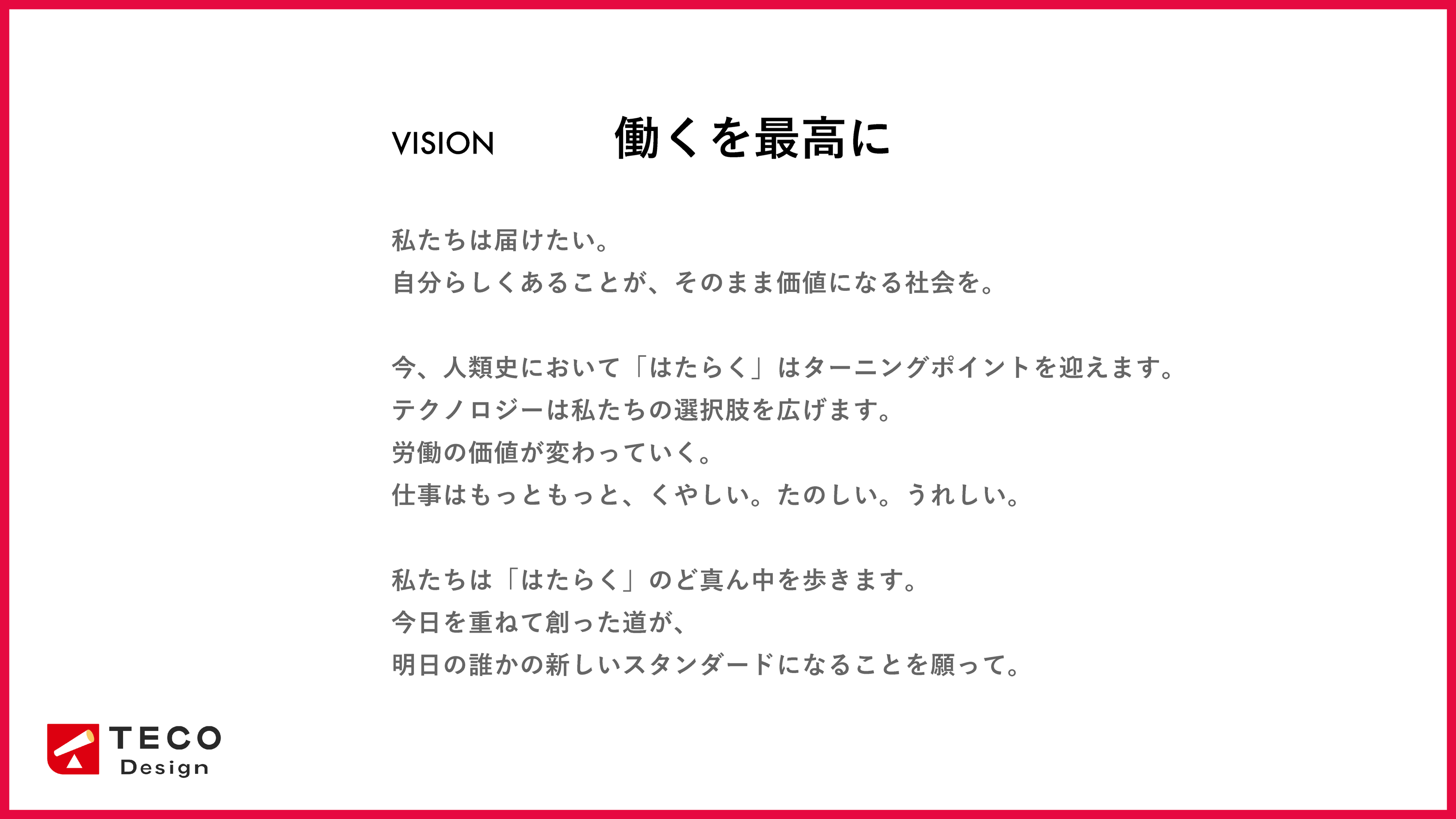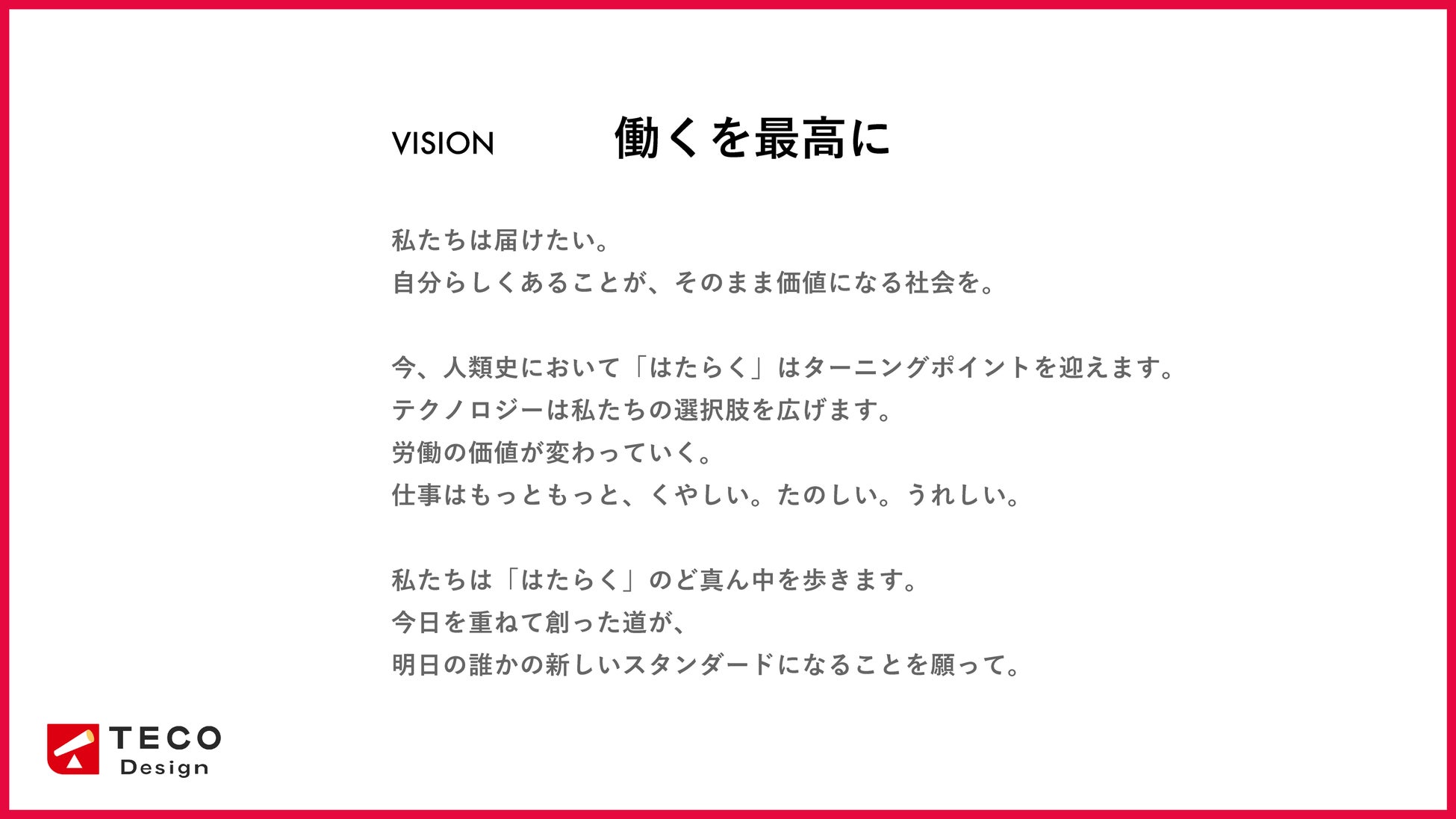 株式会社TECO Design(本社:東京都新宿区、代表取締役:杉野愼)は、このたび新たなVisionステートメント「働くを最高に」を策定いたしましたことをお知らせいたします。
