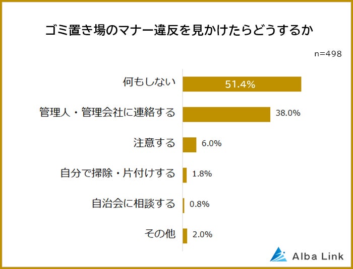 「ゴミ置き場のマナー違反を見かけたらどうするか」という問いには、「何もしない」と回答した人が51.4%と半数以上にのぼりました。次に多かったのは「管理人・管理会社に連絡する(38.0%)」です。