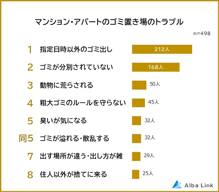 株式会社AlbaLink(本社:東京都江東区、代表取締役:河田 憲二)は、マンション・アパートにお住まいの498人を対象に「マンション・アパートのゴミ置き場のトラブルに関する意識調査」を実施し、そのデータをランキングにしました。