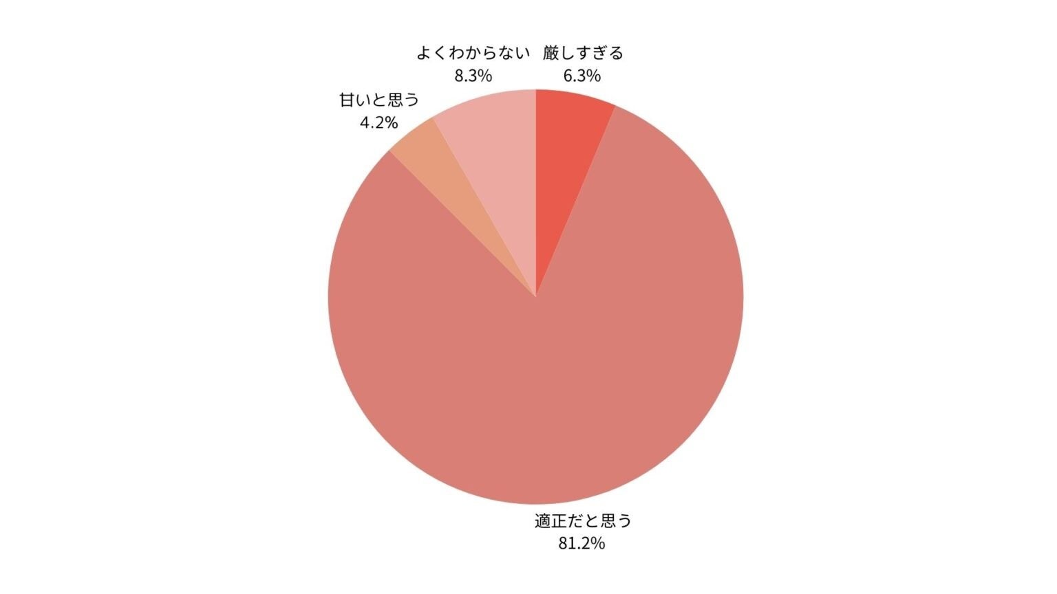 レイクの審査基準については、「適正だと思う」人が81.2%で最も多かったが、「甘いと思う」人は4.2%であった。