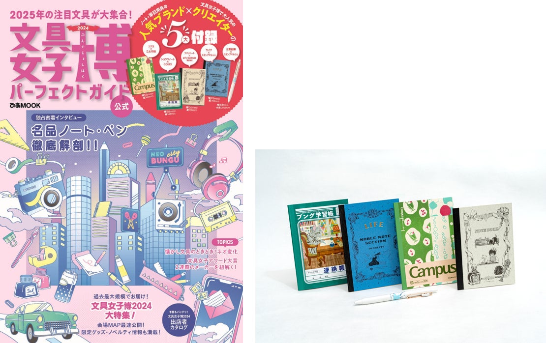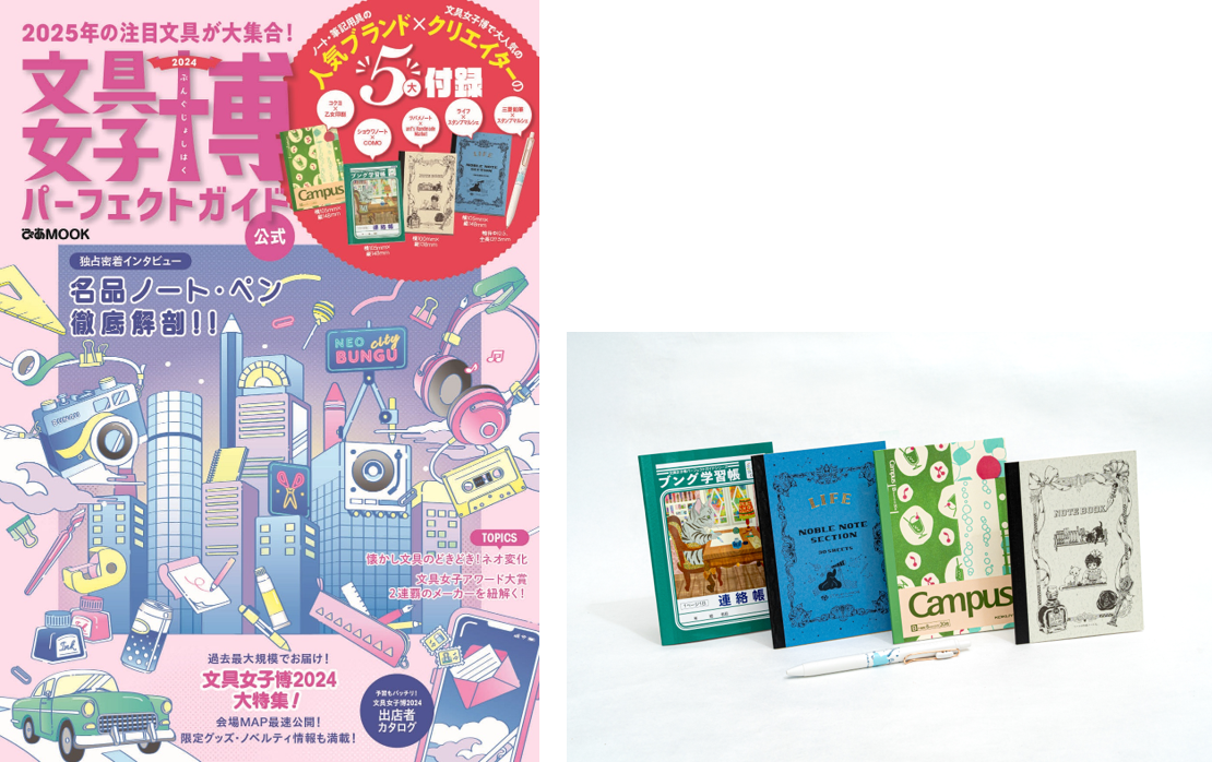 会場MAPや各出店者の紹介など、予習に最適な「文具女子博2024パーフェクトガイド」は全国の書店・ネット書店で好評発売中です。なんと豪華5大付録付き!
