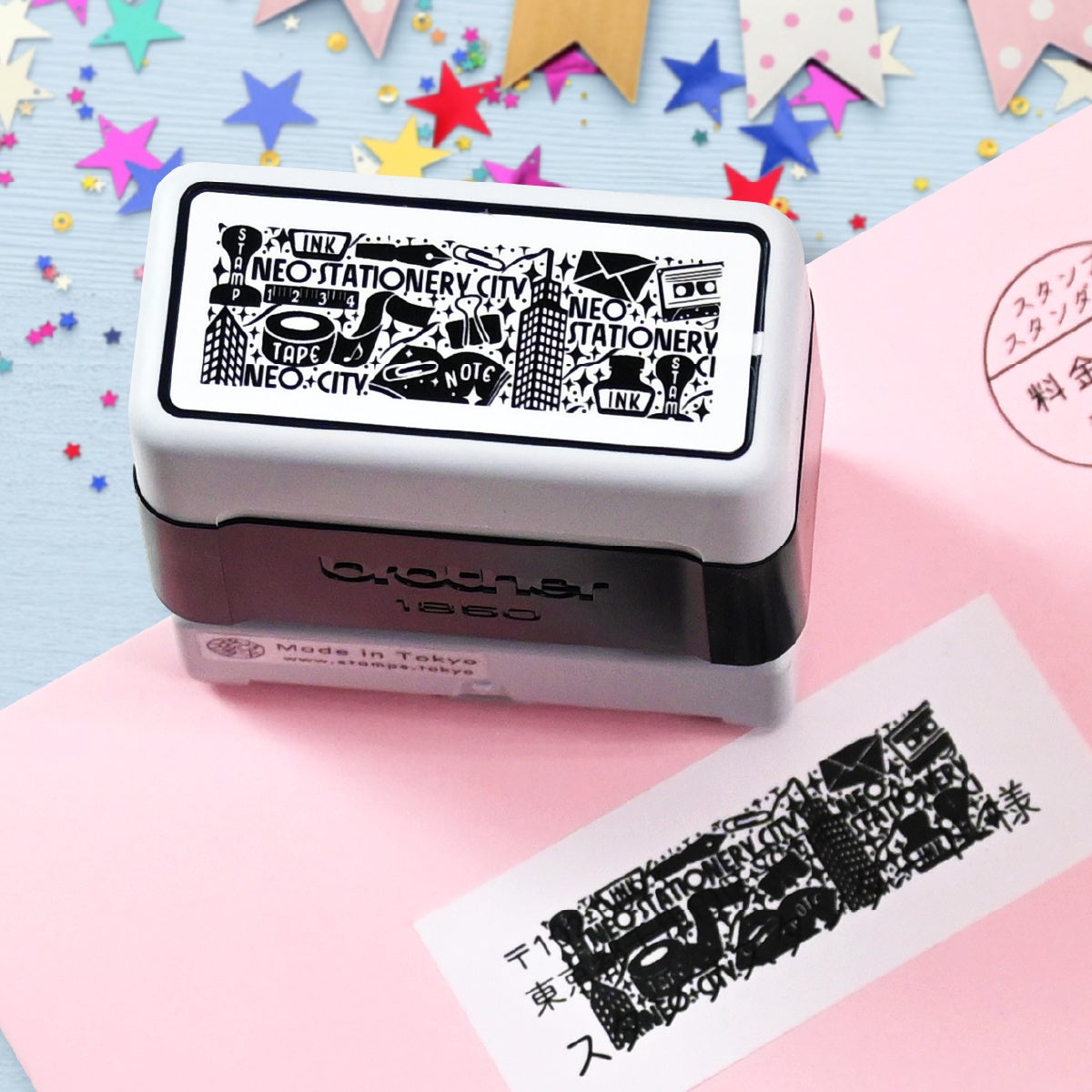 主にハガキや封筒の住所・宛名等に捺して、文字を見えにくくするカバースタンプ。「どきどき!ネオ文具シティ」をイメージした文具女子博限定デザインです。大切な情報を、手軽に、楽しく、おしゃれに保護できます!