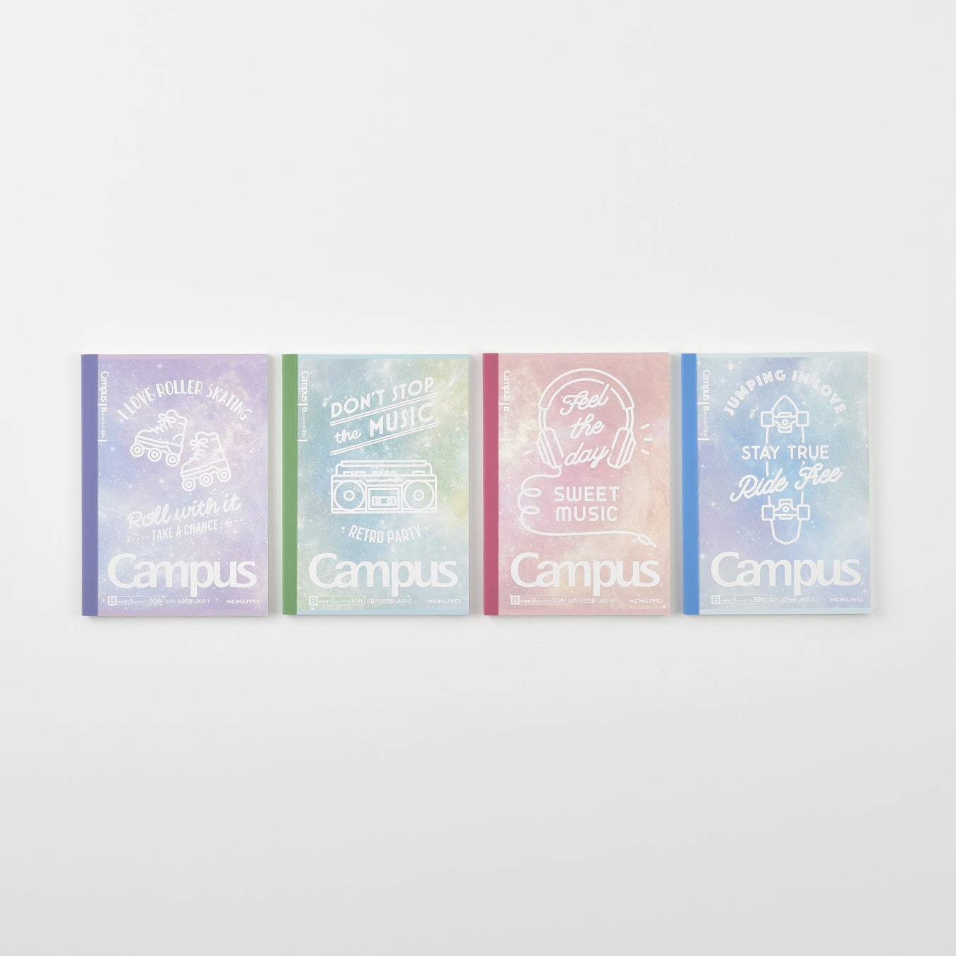 毎年大人気の文具女子博限定A6キャンパスノート!未来を感じさせながらもどこかレトロなデザインに。ローラースケート、ラジカセ、ヘッドフォン、スケートボードをモチーフとしたデザインの4柄セット。