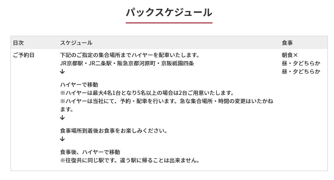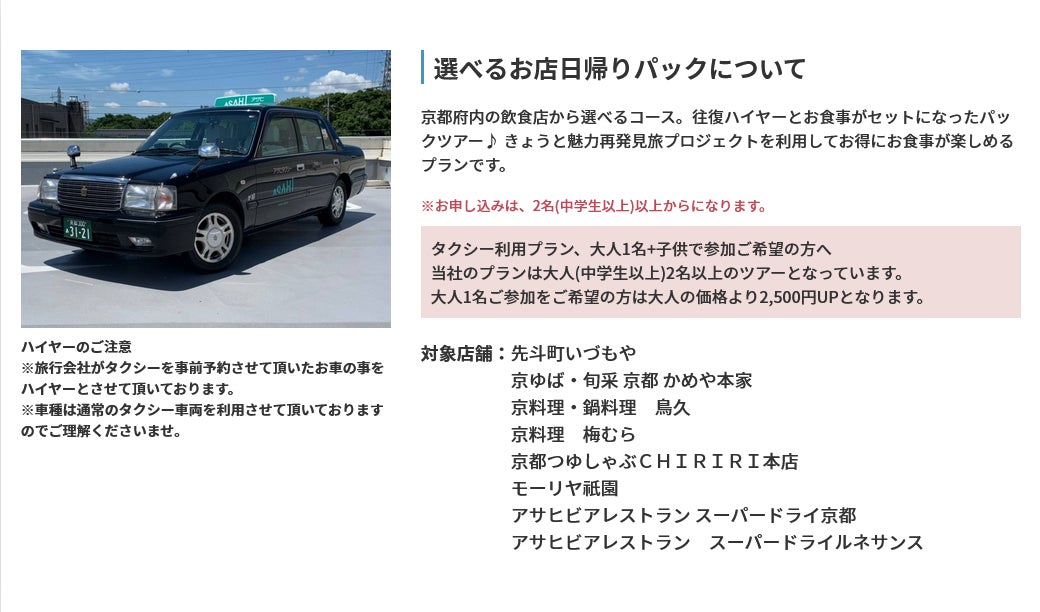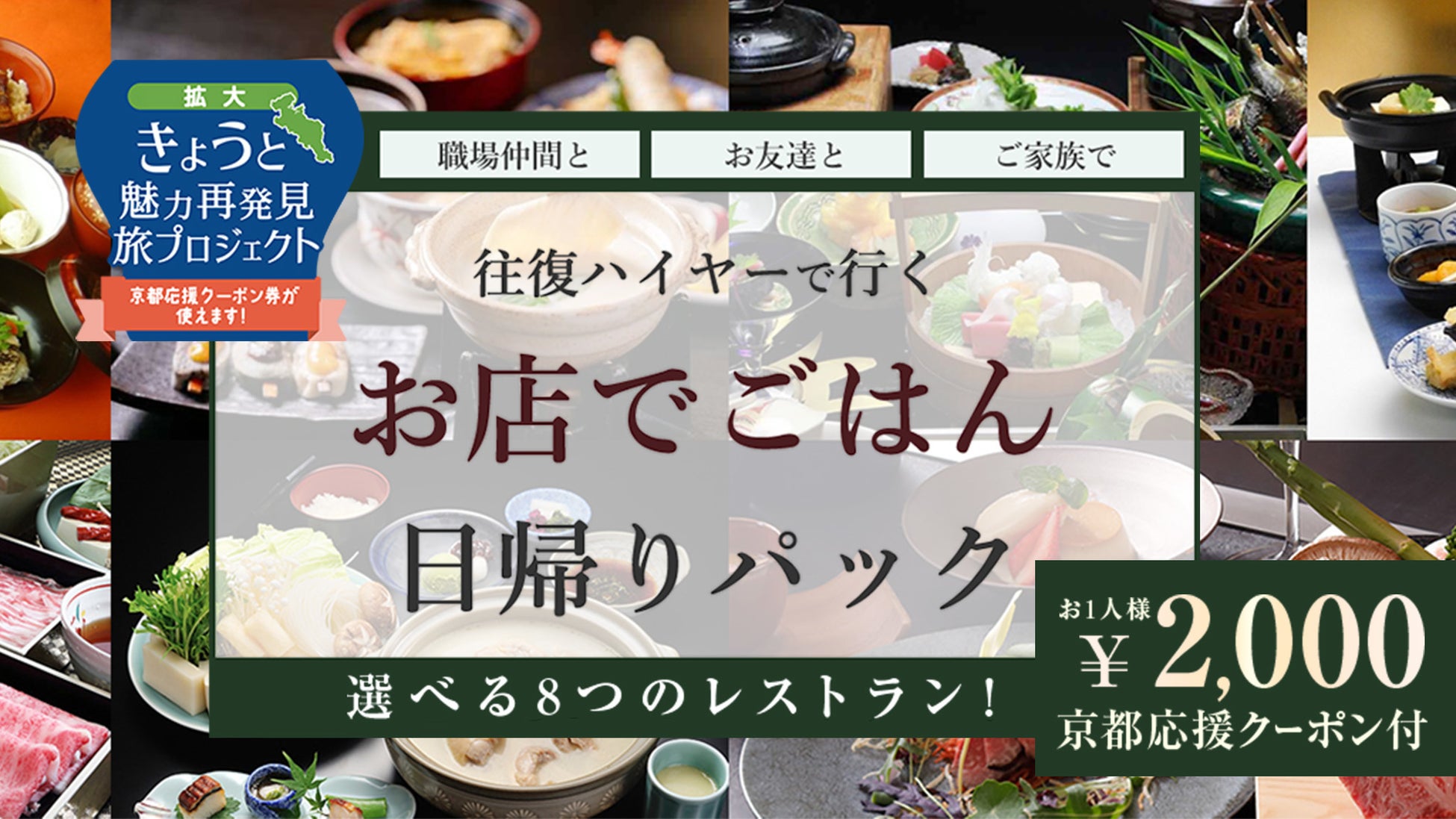 京都府内の飲食店から選べるコース。往復ハイヤーとお食事がセットになったパックツアー♪ きょうと魅力再発見旅プロジェクトを利用してお得にお食事が楽しめるプランです。