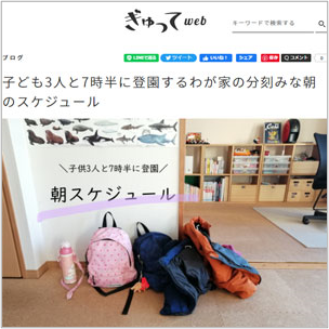 ぎゅってブロガーは、ぎゅって読者である“働くママ・パパ”代表の読者ブロガー組織です。書き手は、子どもを保育園に預けて働くママとパパたち。朝ごはんレシピ、毎日のタイムスケジュール、寝かし付け術、買ってよかったお食事アイテム、なくてはなら ない調理家電、育児あるあるなど…。仕事に、育児に、家事に奮闘するリアルな毎日をブログで発信しています。