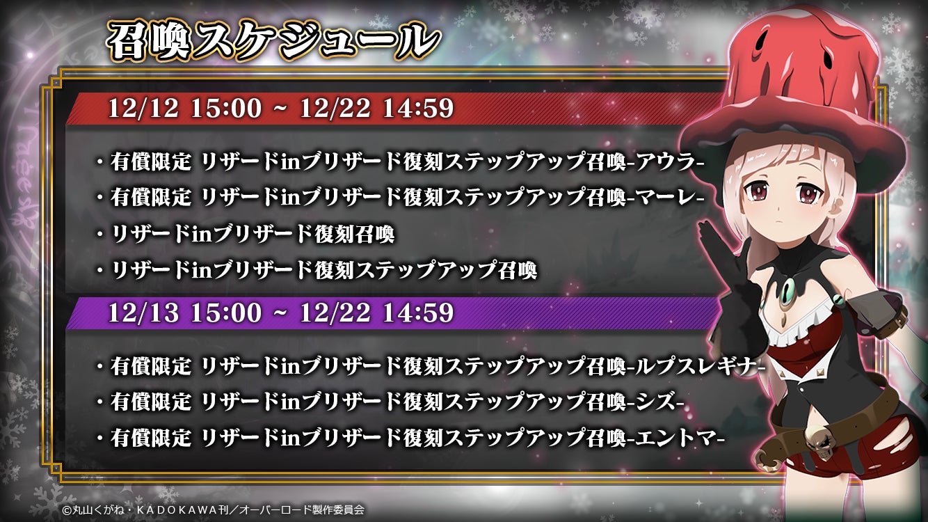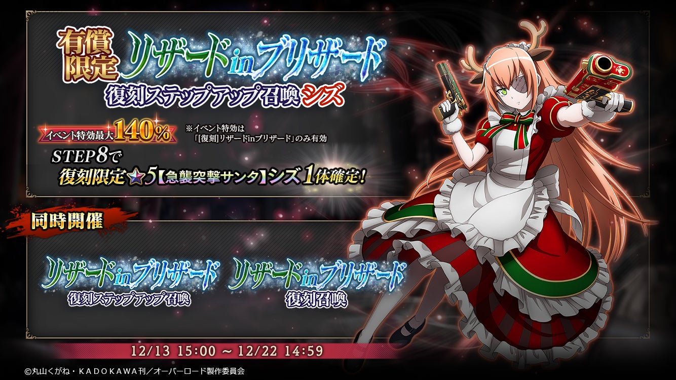 12/5よりアーリークリスマスキャンペーンを実施!人気のイベント『[復刻]ナザリック×クリスマス』を開催いたします!さらに、12/12からはイベント『[復刻]リザードinブリザード』も開催!イベント連動召喚では『★5【純白のサンタ】アルベド』が復刻登場!さらに、アーリークリスマスキャンペーンとして復刻イベントの開催や、過去の★5キャラクターも復刻登場!