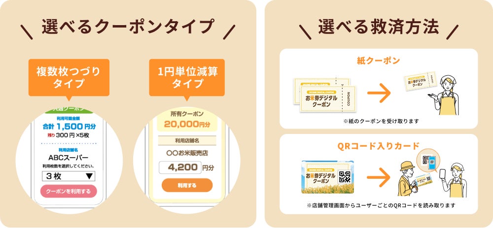 生活支援をしつつ事業者支援に少し重きをおいたデジタル商品券で、共通クーポンと個店クーポンに分けて配布できます。