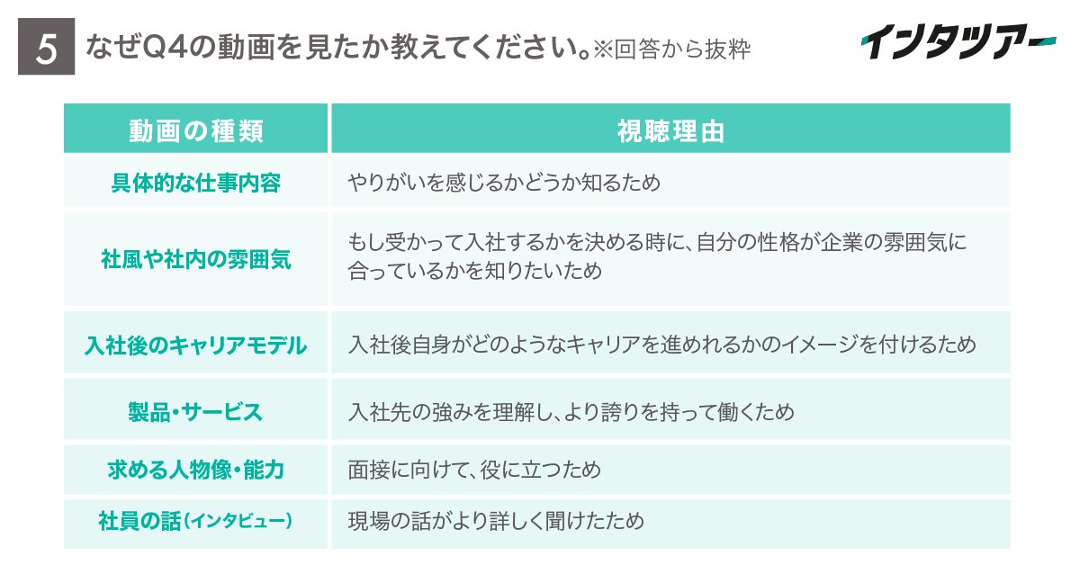 設問2では、Q1で回答した動画を視聴した理由を聞きました。「具体的な仕事内容」では入社後の仕事内容をイメージしたいという回答が多く、その他の回答では、自分とマッチしているかどうか、会社を選ぶ軸の参考としたい、といった回答が目立ちました。