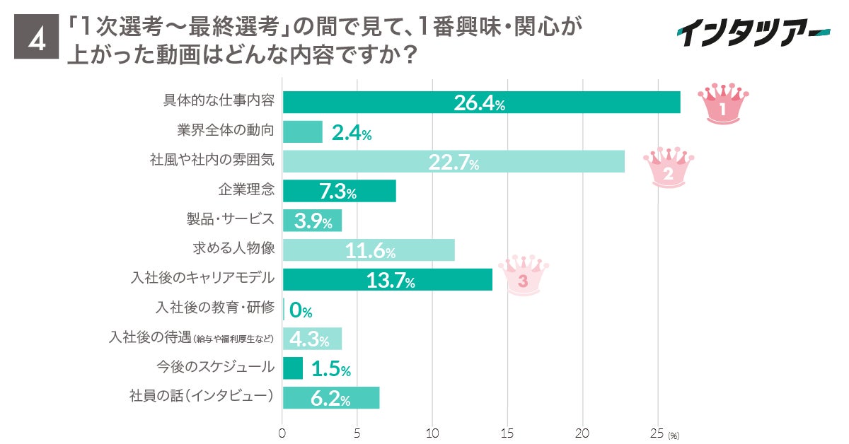 設問4では「1次選考~最終選考」の間に見て、1番会社に対する理解が深まった動画の内容について聞きました。設問1に続き「具体的な仕事内容」26.4%が最多となり、「社風や社内の雰囲気」22.7%と続きますが、3番目には「入社後のキャリアモデル」13.7%が上がりました。