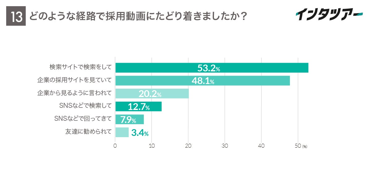 設問13では採用動画にたどり着く経路について聞きました。「検索サイトで検索して」53.2%「企業の採用サイトを見て」48.1%が上位を占め、企業名での検索や企業の採用サイトを使った積極的な情報収集の結果、動画を