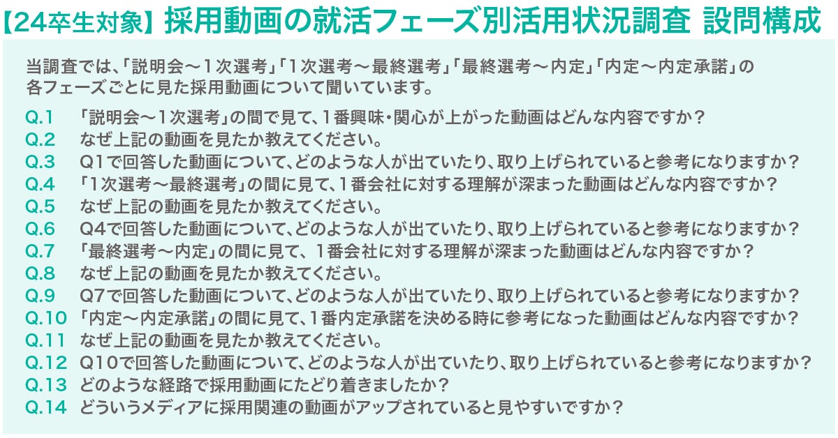 当調査では、就活がほぼ終わりに近づいている24卒生を対象として、就活のフェーズごとに興味関心が高まった採用動画の種類や登場する人物などを聞き、データにまとめました。