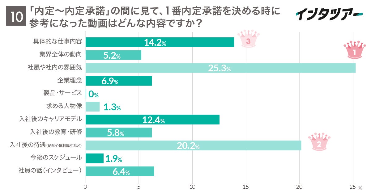 設問10では、「内定~内定承諾」の間に見て、1番内定承諾を決める時に参考になった動画の内容について聞きました。最も回答が多かった選択肢は「社風や社内の雰囲気」25.3%で、「入社後の待遇(給与や福利厚生など)」20.2%が続きました。