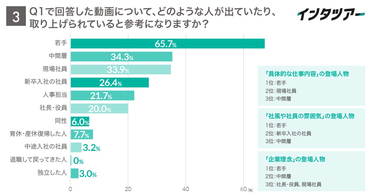 もっとも多い回答は「若手」65.7%で、自分に近い年代の社員がどのような働き方をしているのかイメージすることを重視していることが伺えます。設問1で回答を得た動画の内容ごとに登場人物の回答を集計すると、上位3種類の動画いずれも「若手」が最多の回答でした。