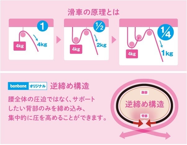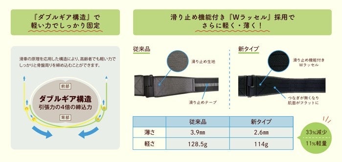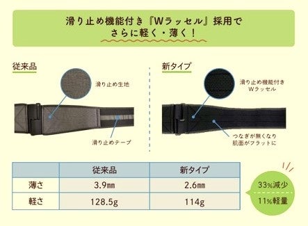 従来品と比べ約11%の軽量化!着けていることを忘れそうな軽やかさです。また、全体的に薄くなり外観に響きにくくなりました。周りの目を気にせず腰をサポートします。