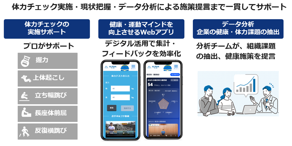 ALPHA for Bizは、従業員の健康・体力課題をデータで可視化することで健康・運動に対するマインドを高め、労災防止や健康経営の取り組みをサポートするサービスです。具体的には以下3つのサービスで構成されています。