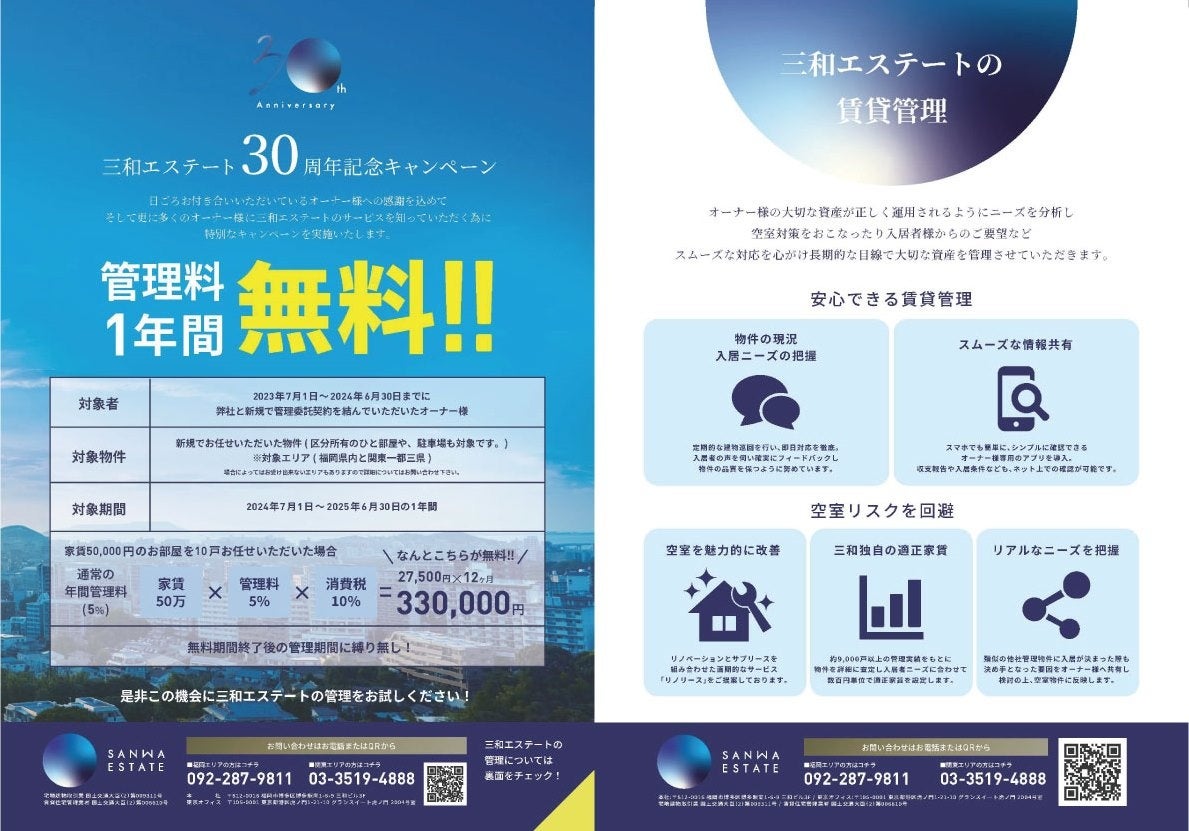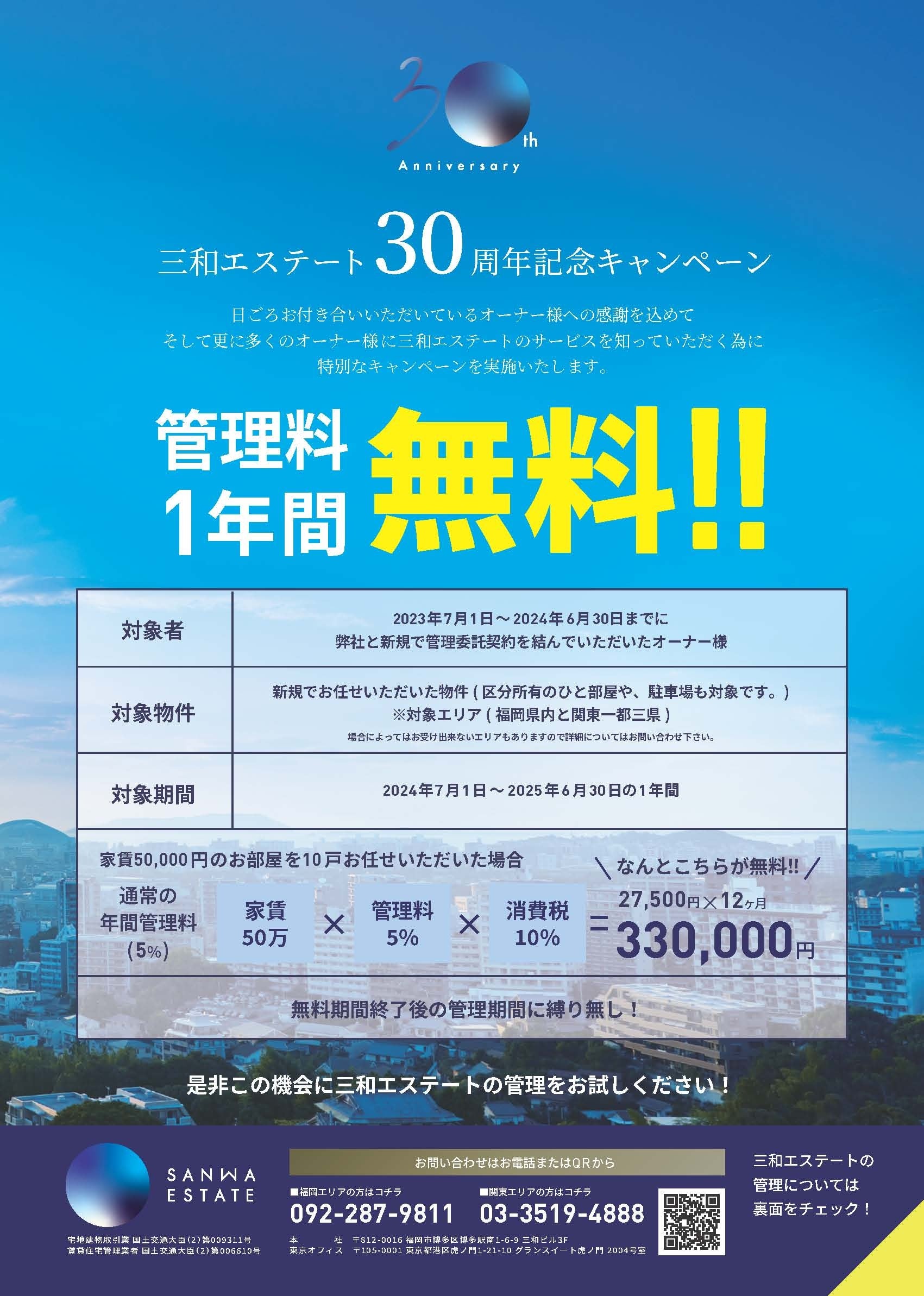 【新規管理委託契約で管理料が1年間無料!!】三和エステートの30周年感謝キャンペーン第3弾!