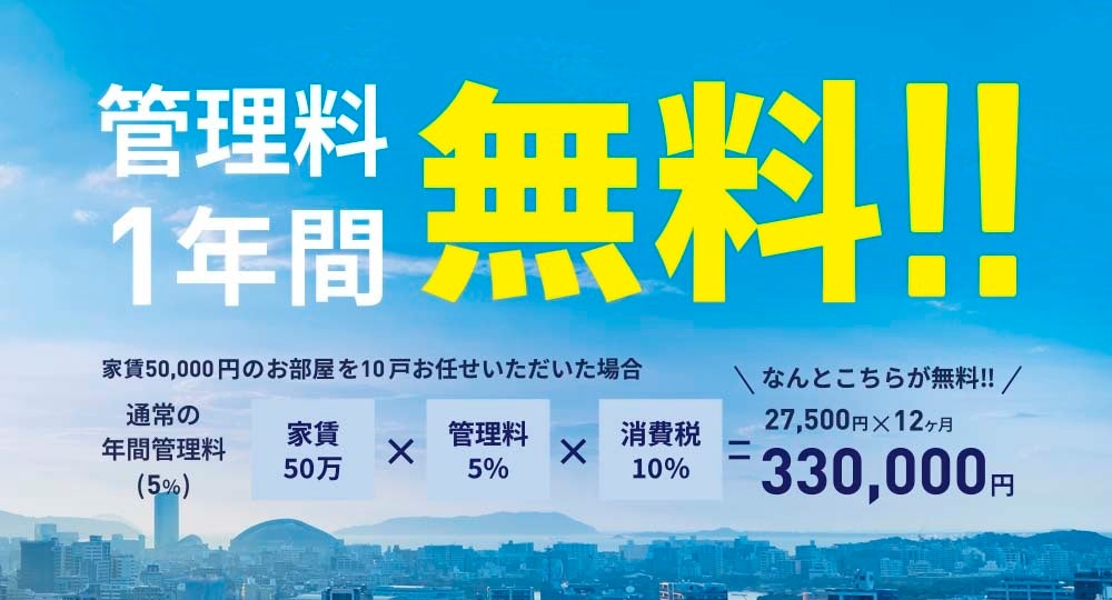 【キャンペーン内容】: 期間中、新たに賃貸管理のご契約をいただいた物件の管理料を1年間無料