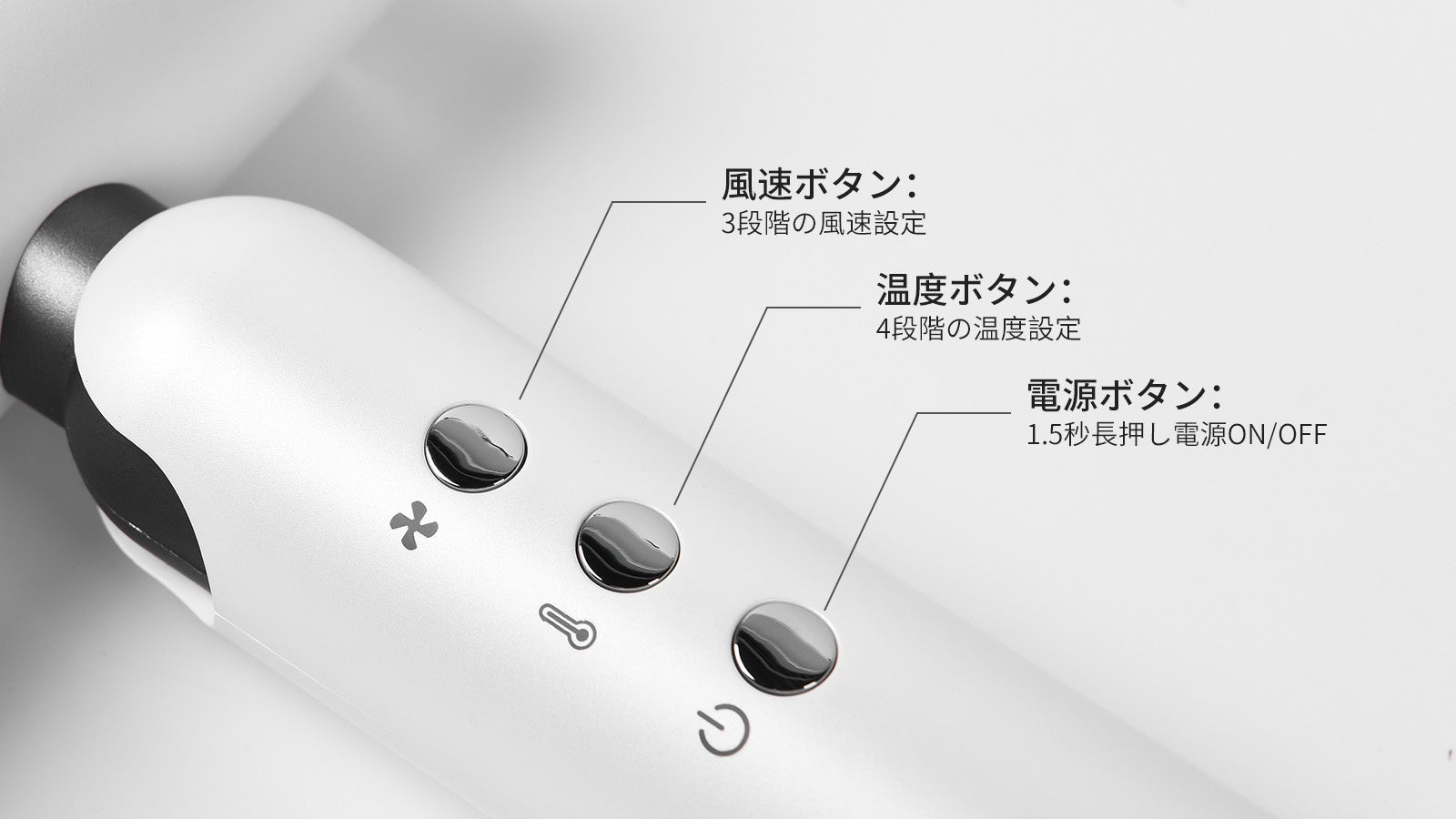 風速ボタン:3段階の風速設定1回押すごとに風速段階を切り替えられ、各段階はディスプレイ上の「Speed」表示ボタンのインジケーターライトの点灯数に対応します。