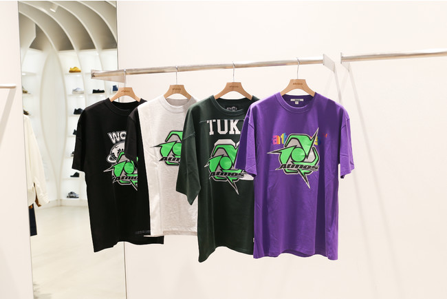 また、atmos独⾃の取り組みとして、過去にサンプルとして制作されたTシャツにオーバープリントを施したリメイクTシャツを販売。