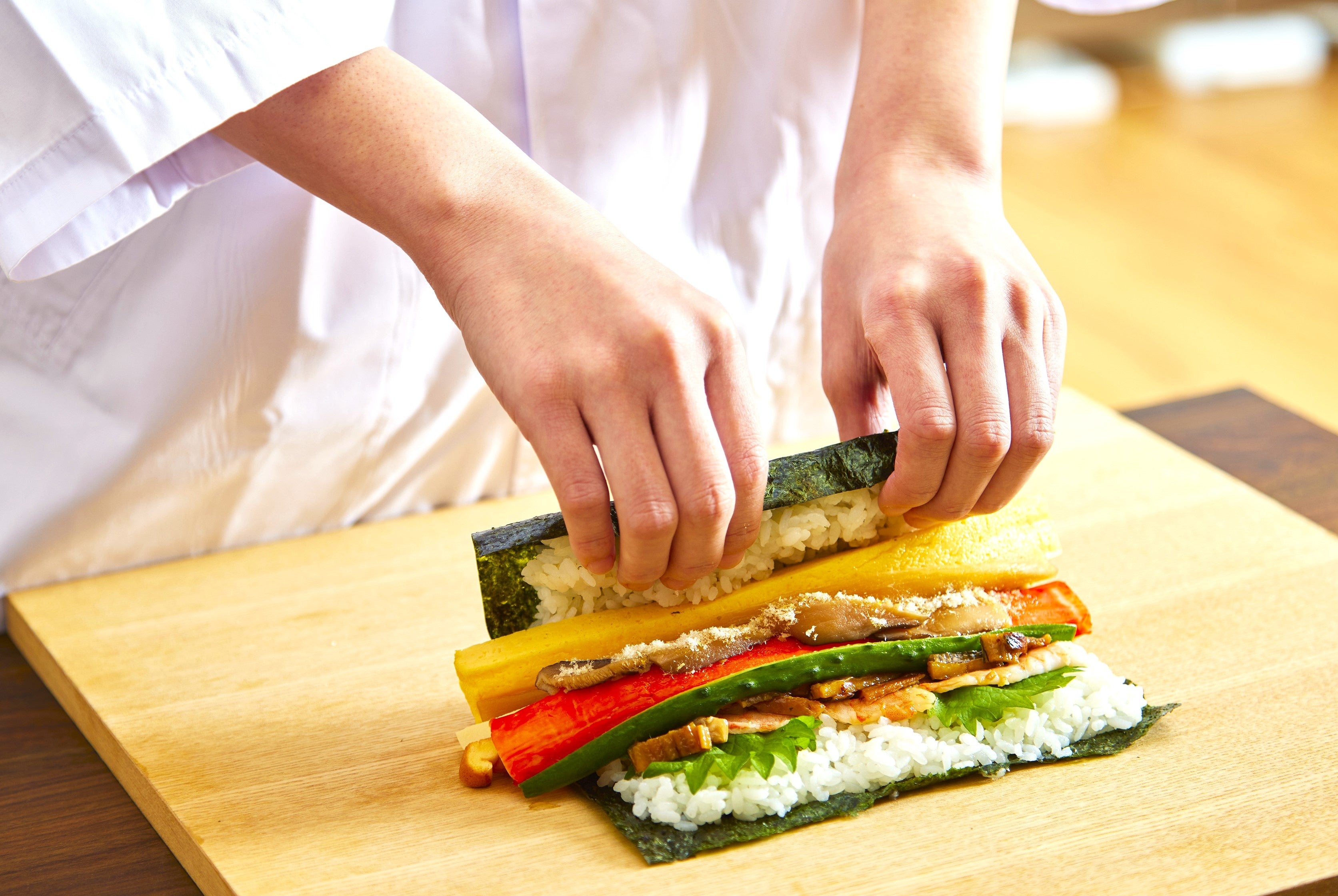 たごさくの「七福恵方巻」は、一本ずつ丁寧に、店舗で手巻きをしていることが最大の特徴です。味わいと彩りの調和を大切に、”七福神“にちなんだえび、穴子などの七つの具材を巻き込み、節分を華やかにする一本に仕上げています。今年一年の福を願い、たごさくの恵方巻を楽しんでみませんか?