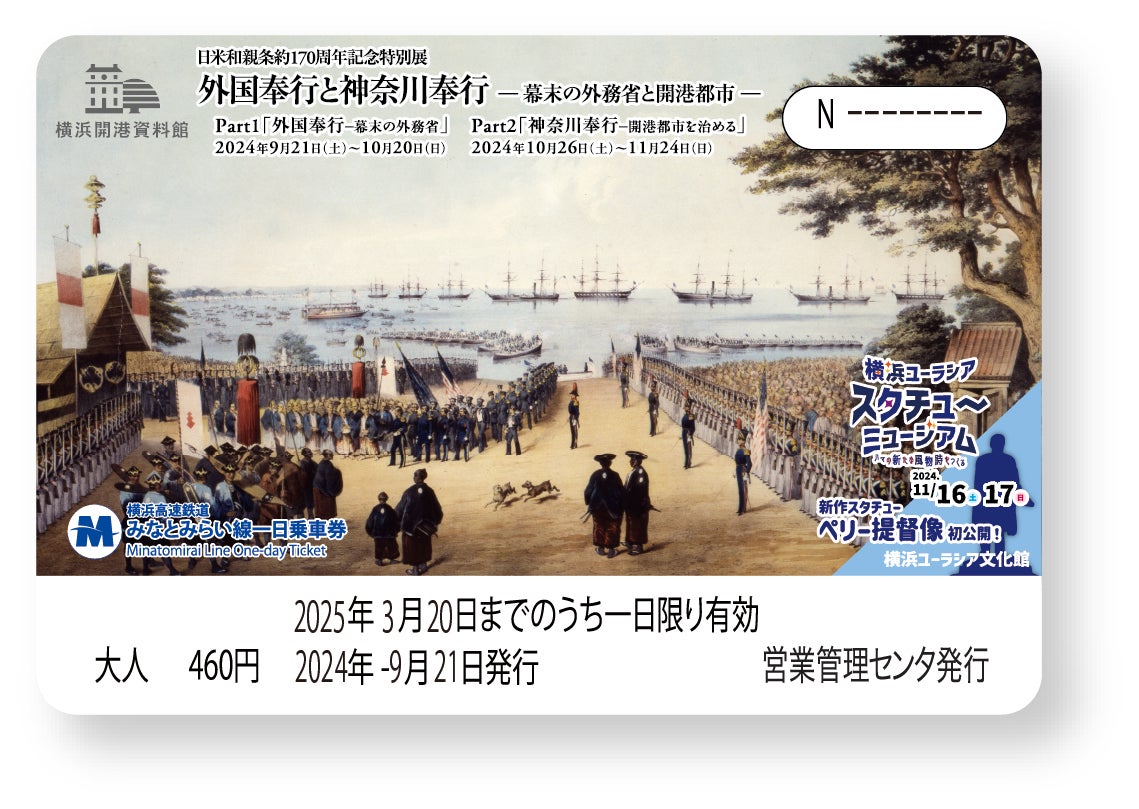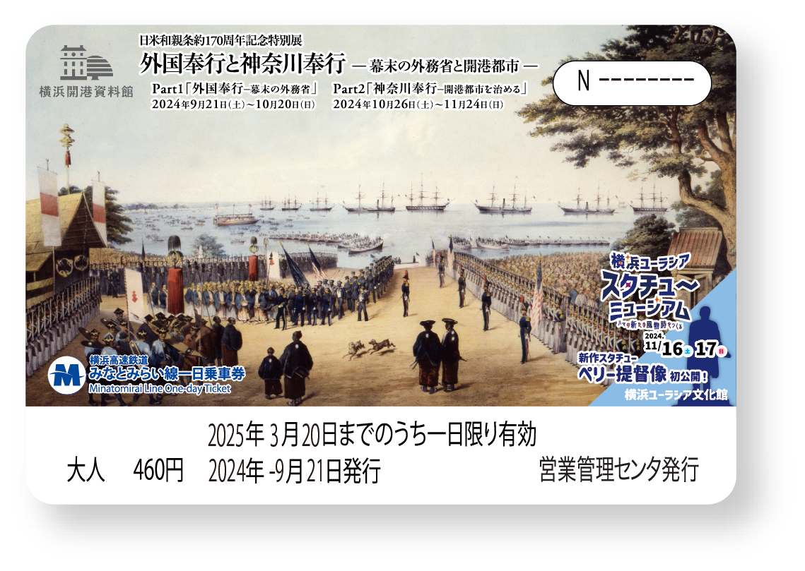 みなとみらい線一日乗車券の提示でご優待! 本一日乗車券の提示により、以下の優待が受けられます。 ※1枚につき1名様まで①・②を対象施設で1回ずつ受けられます。 ①観覧料割引:対象施設が団体割引料金にてご入館・ご観覧いただけます。 〈対象施設〉横浜開港資料館・横浜都市発展記念館・横浜ユーラシア文化館 ②横浜開港資料館ミュージアムショップ&カフェPORTER‘S LODGE割引:ドリンク50円割引 [対象期間]2024年9月21日(土)~2025年3月30日(日)まで ※横浜高速鉄道が横浜みなと博物館とコラボして発売中の、「特集展示『良平の横浜みなと・街歩き』」 オリジナルデザイン一日乗車券でも、同様の優待を行います。 |