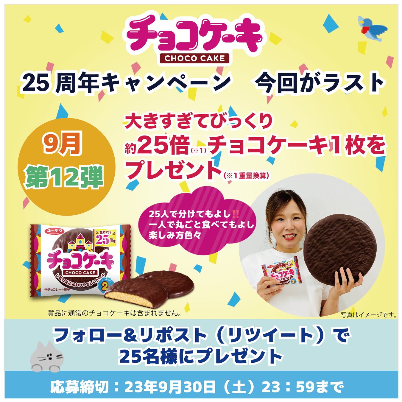 ユーラク「チョコケーキ」は1997年の発売から25周年を迎えたことを記念し、より多くのみなさまにチョコケーキのおいしさや魅力を知っていただけるよう、2022年10月より12か月連続でチョコケーキやオリジナルグッズが当たるキャンペーンを実施してまいりました。25周年に掛けて毎月25日に開催する当キャンペーンの第12弾を、2023年9月25日(月)昼12時より開催いたします。今回は当該キャンペーンのラストとなり、ラストにふさわしい賞品として、大きすぎてびっくりな「約25倍(※1)チョコケーキ」1枚をプレゼントいたします。