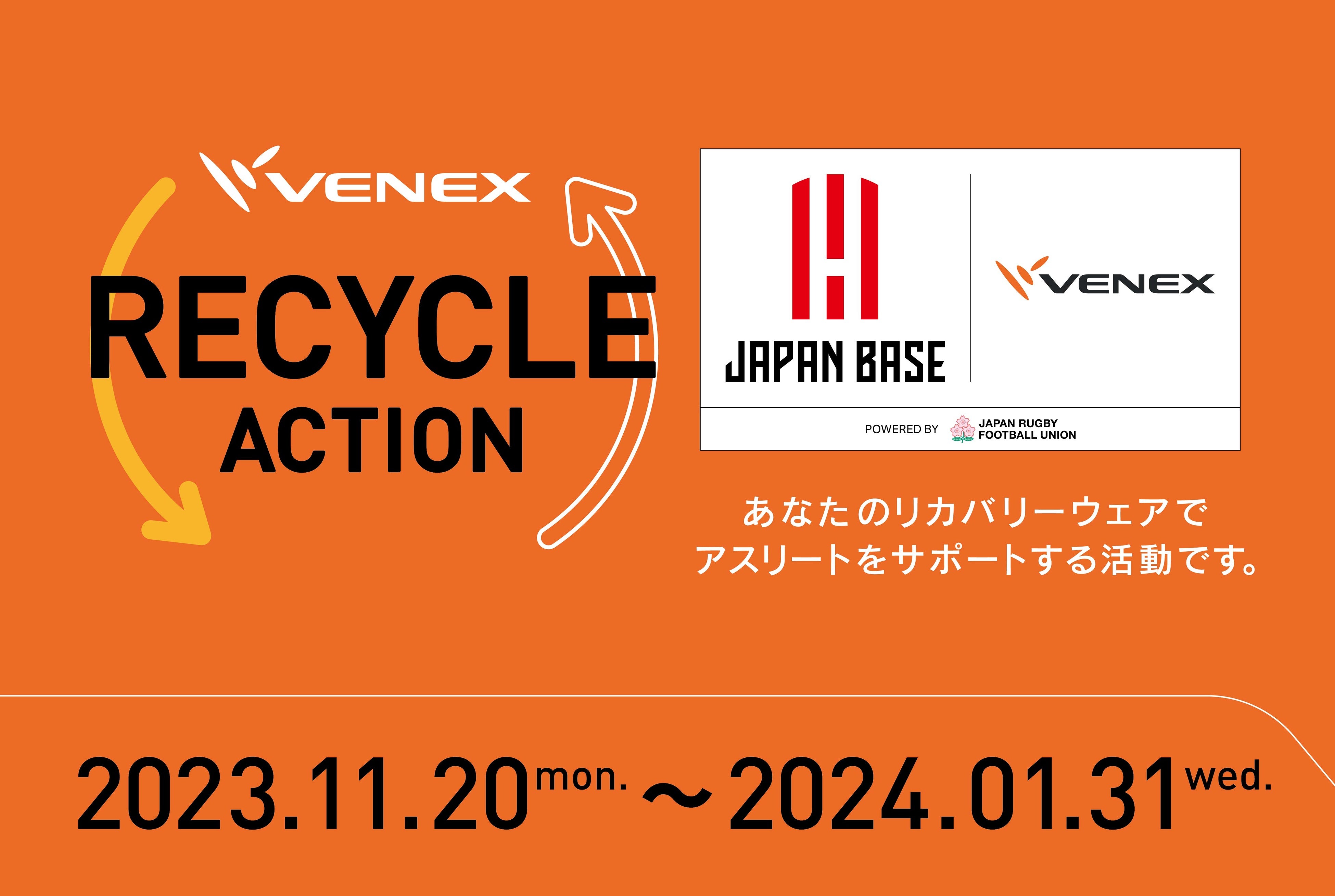 また、「休養」の大切さを発信し続けるブランドだからこそできるサステナブルな事業・ものづくりで、健康で元気な社会の実現を目指しています。このたびその一環として、新たに『RECYCLE ACTION(リサイクルアクション)』キャンペーンを実施することとなりました。皆様がお持ちのベネクスリカバリーウェアを対象店舗に持参、もしくはオンライン申込にて当社事務局へ配送いただくと、「リカバリーウェア」購入時にご利用いただける割引特典をお付けします。※1回収した「リカバリーウェア」は、当社がサポートする、日本ラグビーフットボール協会運営の合宿施設「JAPAN BASE」に新設されるリカバリールーム内のアイテム製作や、ベネクスアンバサダー・選手のサポートなどに活用させていただく予定です。