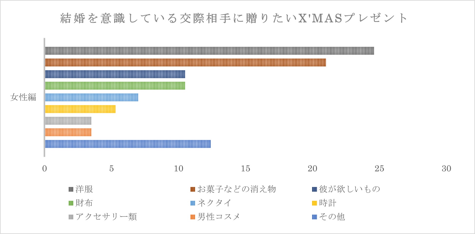 一方で、「お菓子などの消え物」(10.6%)や「美容家電・キッチン家電」(10.6%)など、実用性や消耗品を選ぶ傾向も見られました。男性が選ぶ「贈りたいもの」は、流行に左右されることなく多様化しています。また、一見クリスマスプレゼントの定番と思われがちな「指輪」がランキングで低めに位置しているのは、特別なプロポーズのタイミングに贈りたいという想いの現れなのかもしれません。