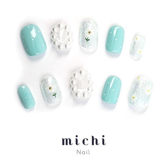 可愛らしい水色とマーガレットのお花がかわいいこちらのネイル。ラブリーだけど爽やかなデザインで初夏のお出かけが楽しくなりそうです。流行りのレースや透け素材のお洋服と合わせると、儚い雰囲気を演出できます。