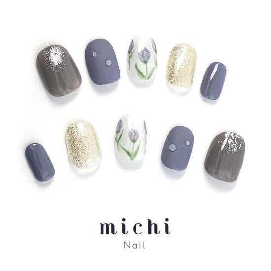 コールドカラーとゴールドラメがシックなこちらのネイル。チューリップの花がキュートですが、ブルーカラーでクールにも見える、大人っぽいおしゃれネイルです。ブルーのネイルにぷっくりと水滴風のアートが施されていて雨の日のお出かけを楽しくしてくれそうです。