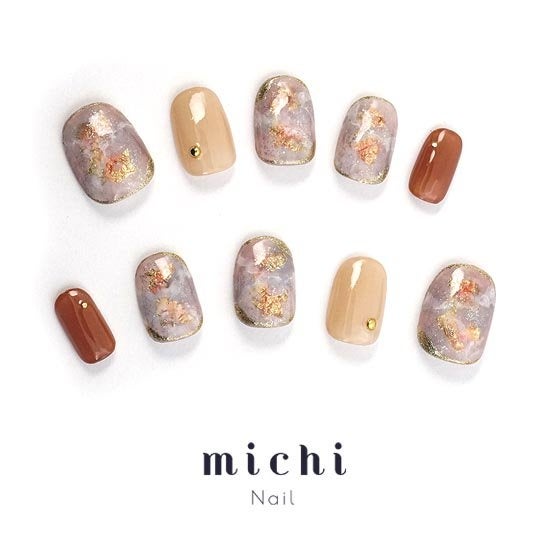 季節を問わず、どんなシーンにも合わせやすいベージュカラーをベースにした天然石ネイル。金箔を使った天然石風のデザインが不思議で個性的な雰囲気です。深みのあるテラコッタカラーが良いアクセントになっています。