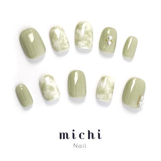 甘くての濃厚な抹茶ラテのようなこちらのネイル。抹茶とミルクが混ざったようなやわらかい印象で、とても可愛らしい印象です。カラーには細かいパールが混ざっているので、さりげなくキラキラ輝きます。可愛らしくてちょっぴり個性的なデザインをお探しの方にお勧めです。
