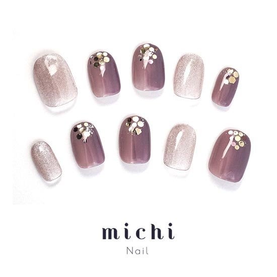 落ち着いた色味のパープルが上品で芸術的なこちらのネイル。爪先には丸い大小様々なゴールドのホログラムが飾られています。マグネットジェルがキラキラ輝き、ゴージャスな雰囲気です。ドレスや特別な日のお洋服と合わせたい高級感たっぷりのネイルです。