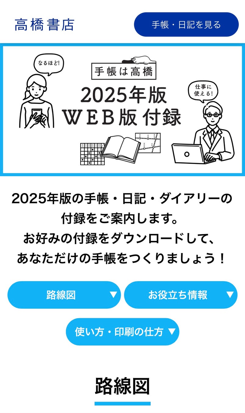 昨年発売の2024年版1月始まりより、一部の付録をWEB版に移行しました。今回の2025年版ではWEBで見られる付録の種類を全13種類に拡大し、さらにWEBで見るだけでなく、印刷して使いたい方向けに印刷用のデータもご用意しました。自分に必要な付録をダウンロードして印刷し手帳に貼ってお使いいただけます。いずれも奥付に印刷された二次元コードから、いつでもどこでも簡単にアクセス可能です。(※)