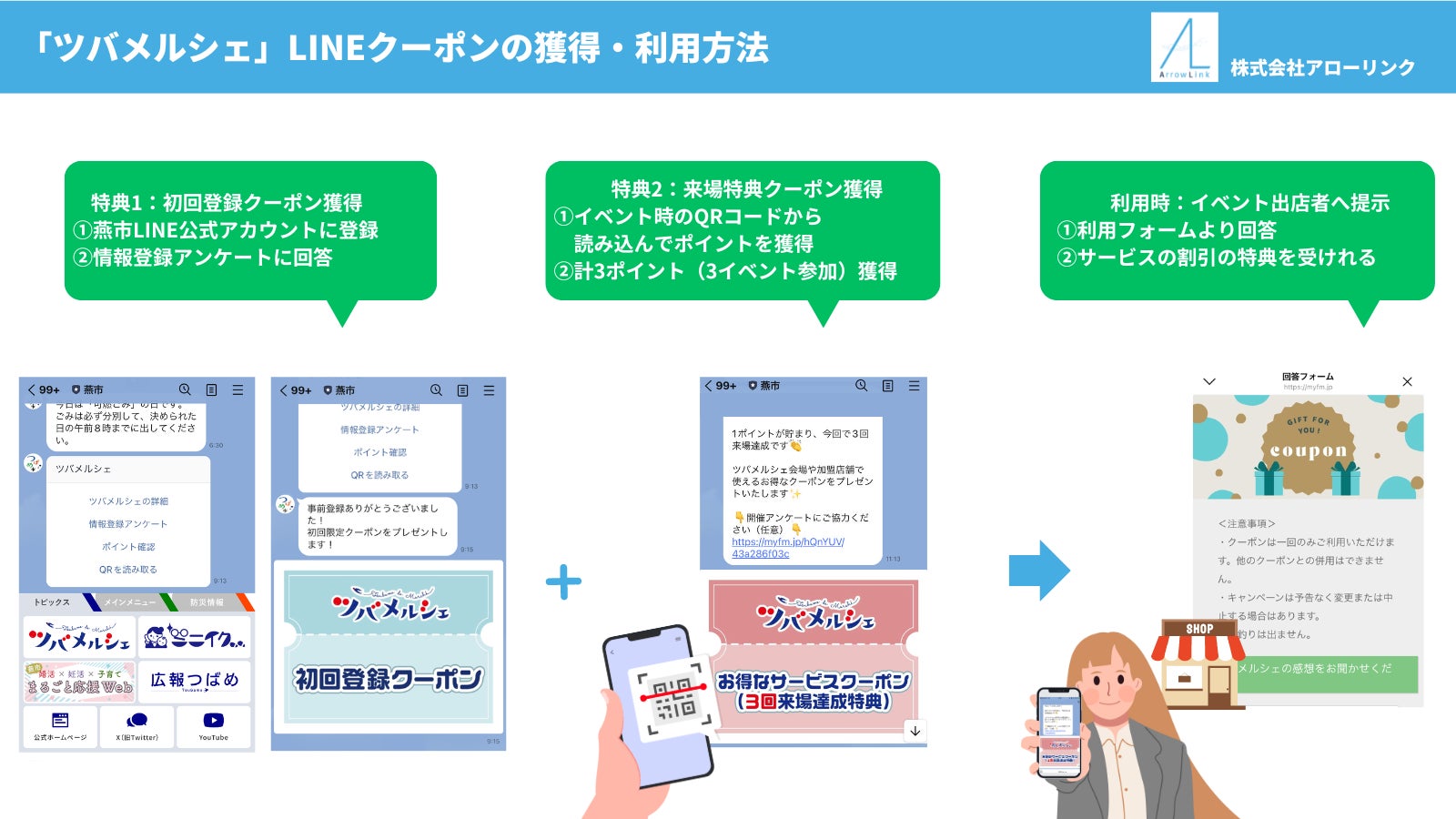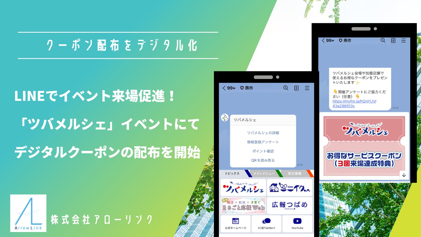 この度、株式会社アローリンク(本社:兵庫県神戸市中央区雲井通4-2-2 マークラー神戸ビル4階、代表取締役:蓬莱和真)は、新潟県燕市(市長:鈴木 力)が「持ち運べる役所」としてLinyを活用し、燕市LINE公式アカウントにて市の商業を盛り上げるお店が集まるイベント「ツバメルシェ」事業で利用できるクーポン配布の案内を開始したことをお知らせします。