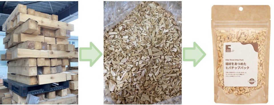 端材の活用方法は自由自在です。例えば建材の加工時に出た端材を粉砕してつくられた「ヒバチップパック」は、クローゼットの消臭用に置いたり、お風呂に浮かべたりと様々な方法でお楽しみいただけます。
