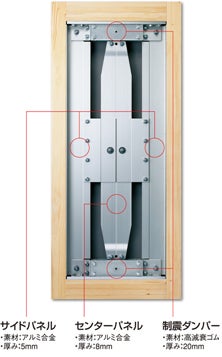 木造軸組住宅用の制震装置「MGEO-N」およびMGEOシリーズの木質系工業化住宅用制震装置「MGEO」は、1階内壁に2か所配置※4することで高い制震性を発揮する制震パネルです。地震などの建物を変形させる力をテコの原理で増幅させ、センターパネルが地震エネルギーを内部の制震ダンパーに伝えて、制震ダンパー部の高減衰ゴムが地震エネルギーを熱エネルギーに変換・吸収し、揺れを抑えます。高減衰ゴムは住友ゴム工業株式会社が培ってきたレーシングタイヤの開発技術を応用して開発されており、促進劣化試験※5では、約100年相当の高い耐久性を確認しています。