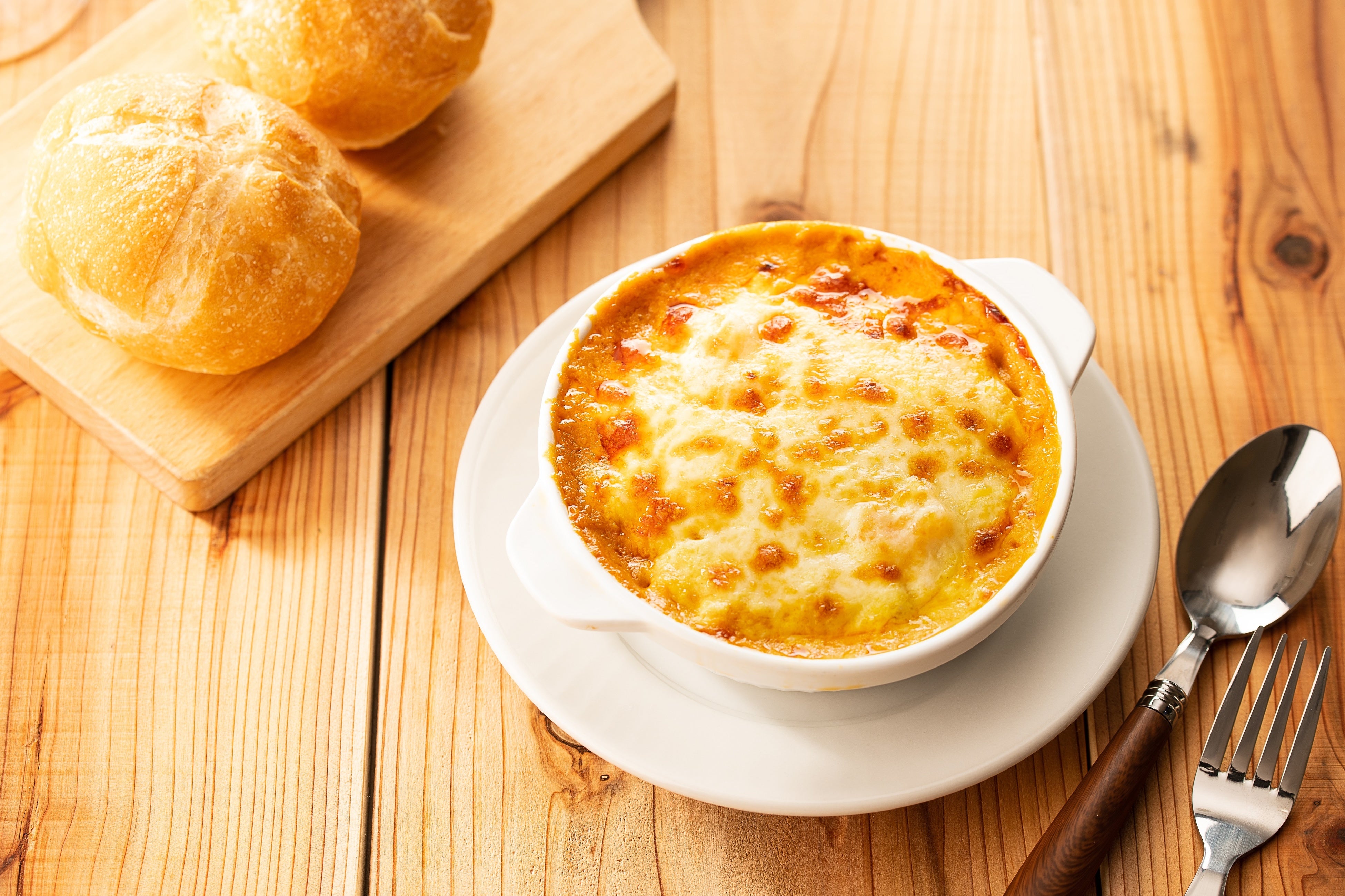 特製のアメリケーヌソースとコクのあるモルネソースを使用し、海老と小柱をのせて焼き上げたグラタンです。魚介の風味が豊かなで濃厚な味わいに仕上げました。