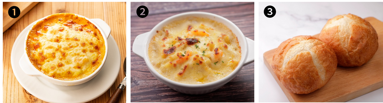 魚介風味豊かなシーフードマカロニグラタンと、チキンの旨みが詰まった海老とチキンのマカロニグラタンの食べ比べセットです。小さめのグラタンはブールをつけてご一緒にお召上がりいただくのがおすすめです。