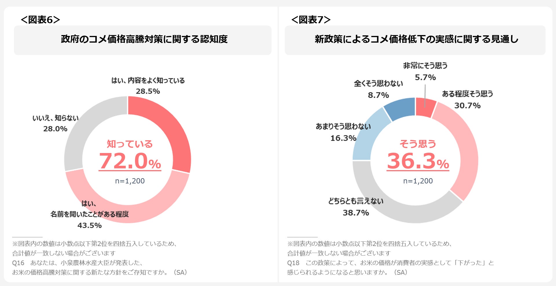 政府が発表したコメ価格高騰対策(2025年5月26日時点)について、72.0%の消費者が認知しているものの、政策内容を「よく知っている」と回答したのは28.5%でした。(図表6)