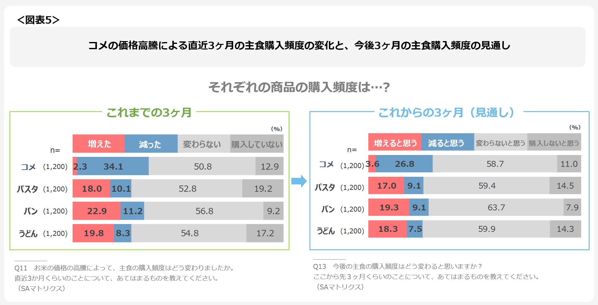 この影響を受け、これまでの3ヶ月間のコメの購入頻度について「減った」と回答した割合が「増えた」を31.8Pt上回る結果となりました。さらに、これからの3ヶ月についても「減ると思う」が「増えると思う」を23.2Pt上回っています。(図表5)