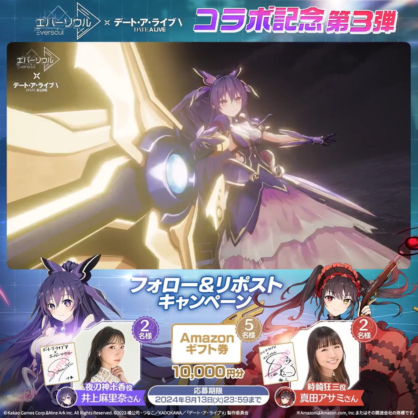 コラボ精霊「夜刀神十香」「時崎狂三」の実装を記念して2024年8月7日(水)より「フォロー&リポストキャンペーン」を実施中です。『エバーソウル』公式X(旧Twitter)をフォローした状態で、該当キャンペーンポストをリポストした方の中から「夜刀神十香」役を演じた「声優:井上麻里奈さん」、「時崎狂三」役を演じた「声優:真田アサミさん」の直筆サイン色紙を抽選で各2名様にプレゼントします!さらに、Amazonギフト券10,000円分が抽選で5名様に当たるチャンスも!