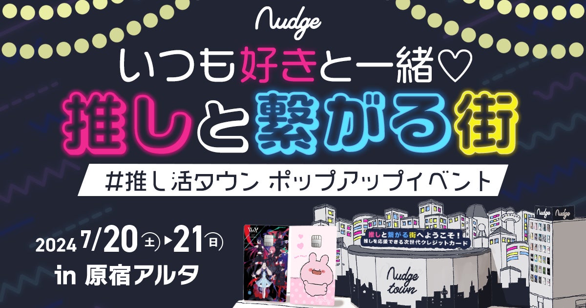日本におけるチャレンジャーバンクを目指すナッジ株式会社 (本社:東京都千代田区、代表取締役:沖田 貴史、以下「ナッジ」) は、次世代型クレジットカード「Nudge (ナッジ、以下「ナッジカード」) 」を運営しており、「普段の買い物を通じて、日常的に推しを応援する」という新しい推し活のかたちを提案しています。この度、新しい「推し」との出逢いや、「推し」をより身近に感じることができるポップアップイベントの第一弾を、2024年7月20日(土)・21日(日)の2日間、原宿アルタにて開催することを決定いたしました。