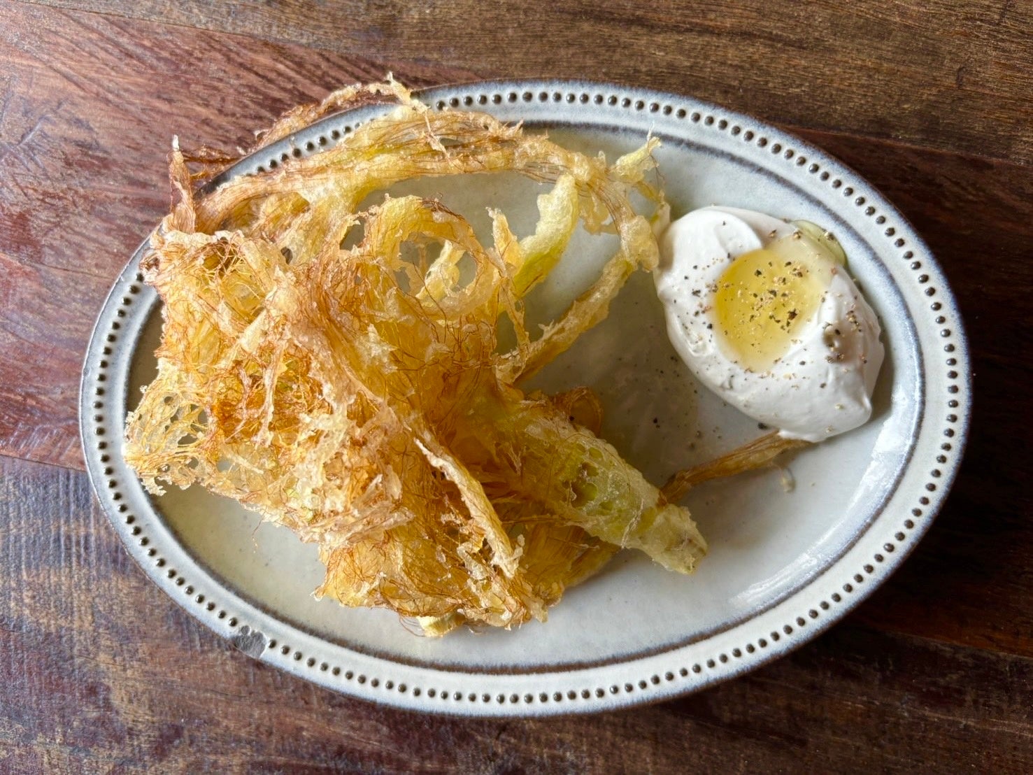 ヤングコーンのまるごとフリット ゴルゴンゾーラのムース添え