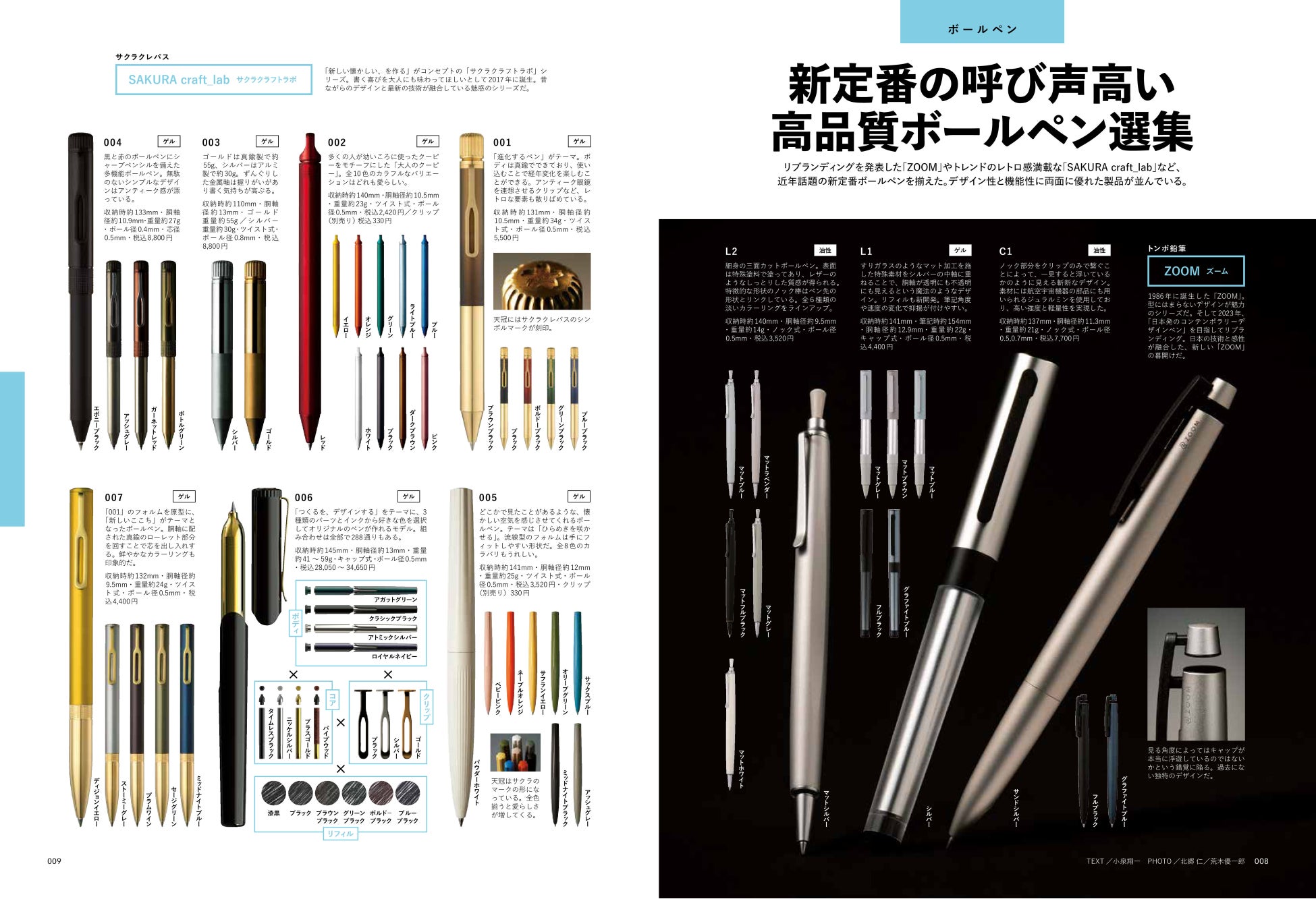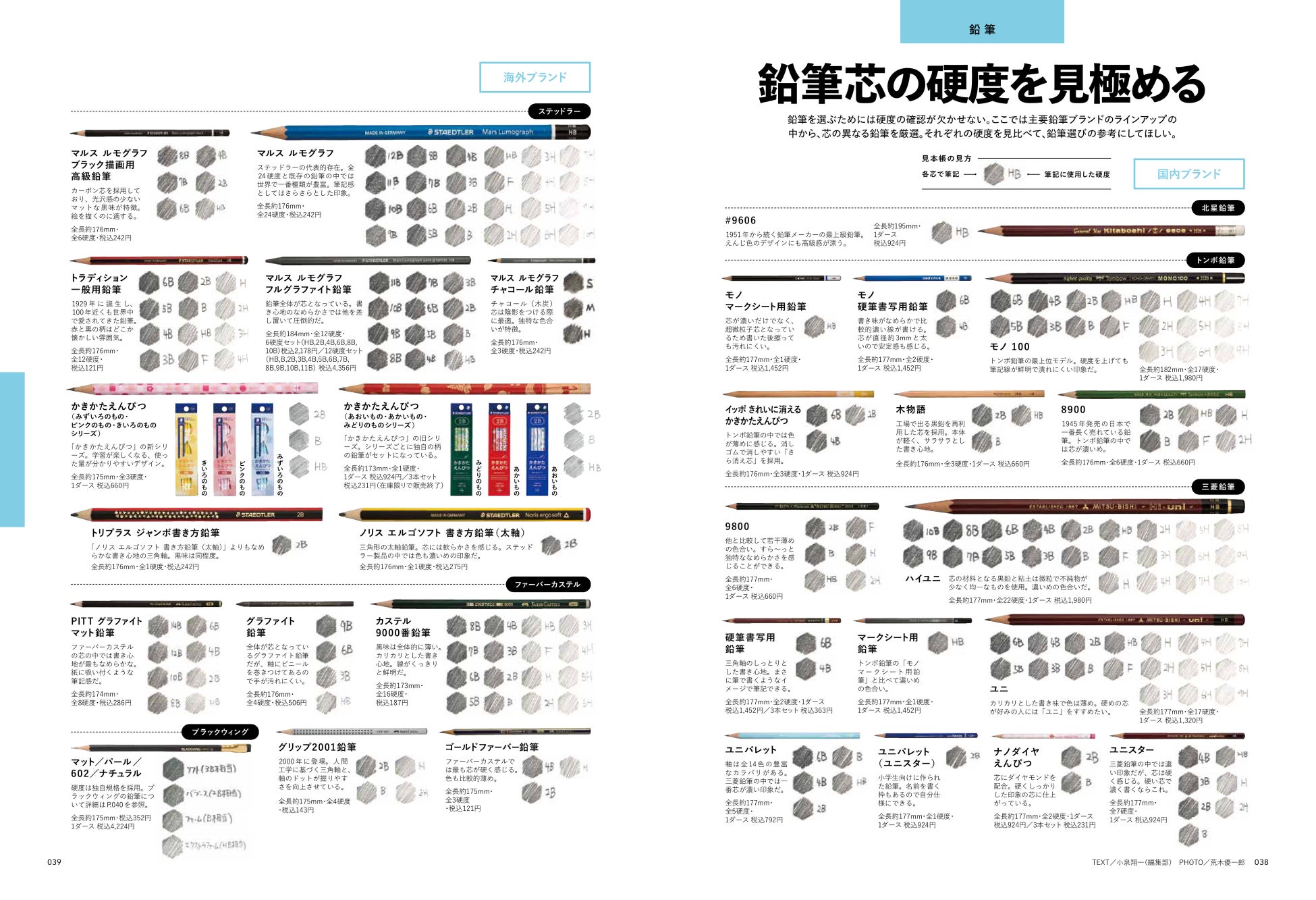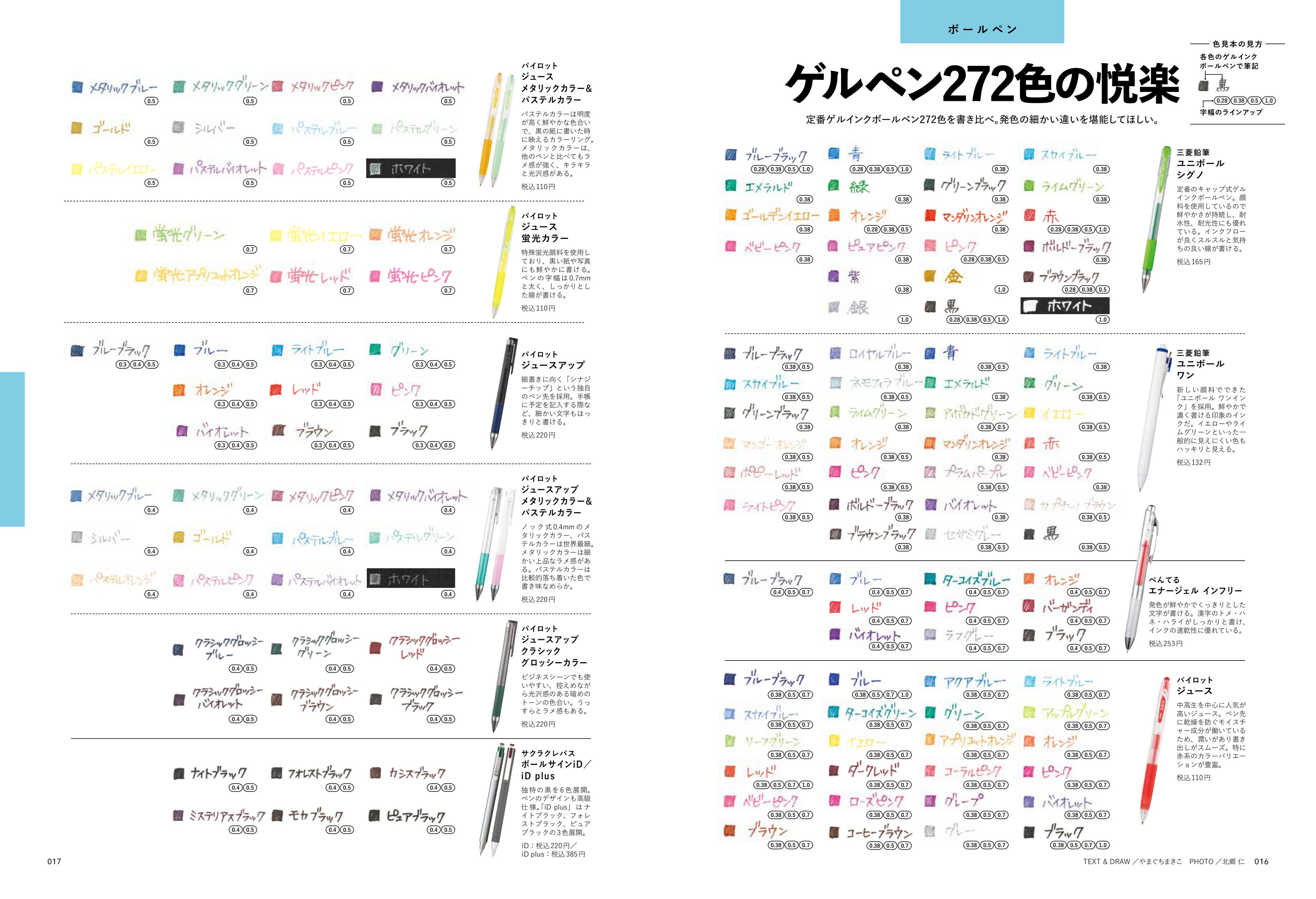 今回は市場で手に入る主な鉛筆やゲルインクボールペン、カラーペン、替芯などの色見本ページもたくさん設けました。色見本帳としての参考はもちろん、各社のラインアップも把握でき、読み応え十分の永久保存版です。