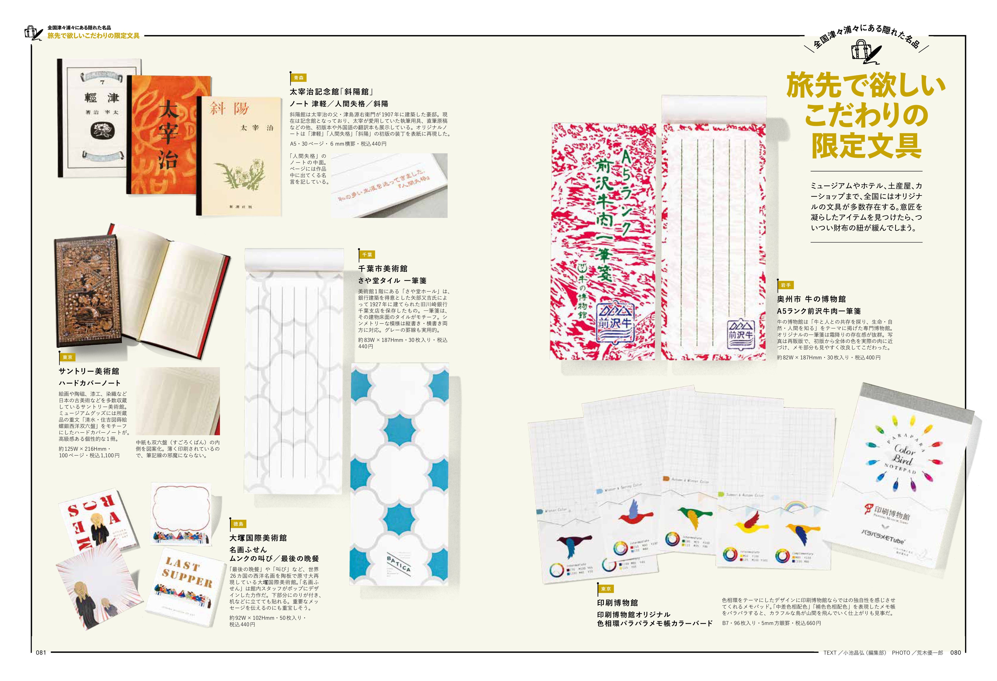 カテゴリー別で図鑑のように文房具を紹介していくページ以外にもさまざまな企画ページを用意しています。「旅先で欲しいこだわりの限定文具」では、ミュージアムやホテル、土産屋、カーショップまで、全国にあるこだわりのオリジナル文具を掲載しています。意匠を凝らした隠れた逸品は、ついつい財布の紐が緩んでしまいそうです。
