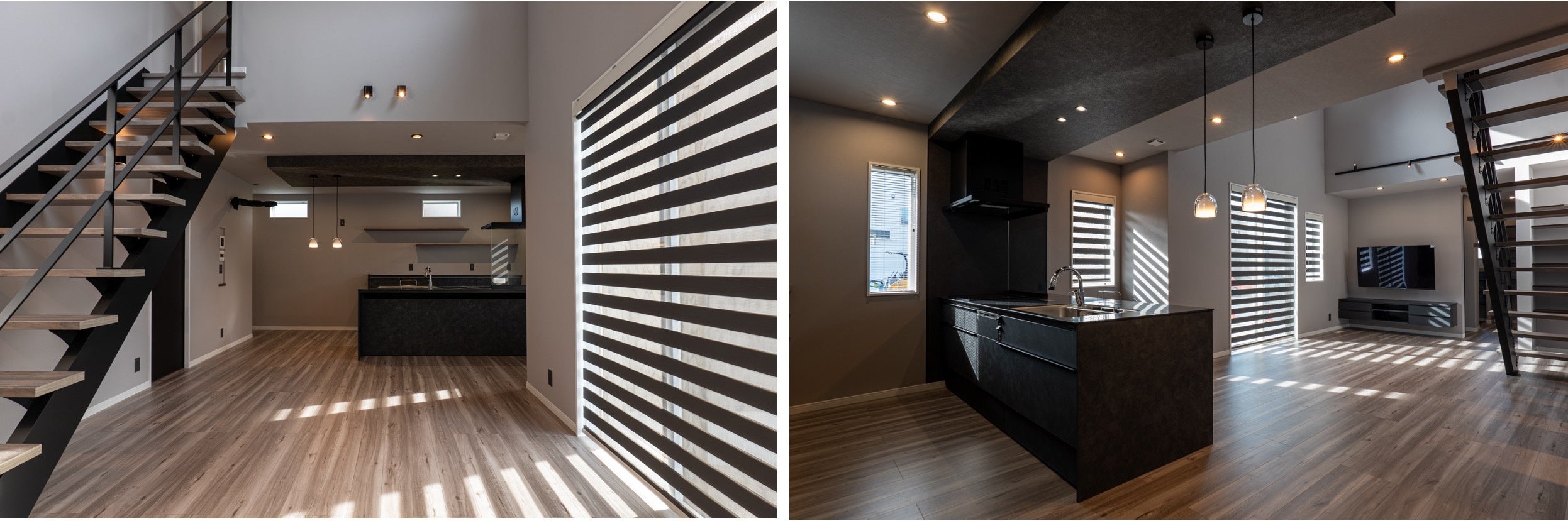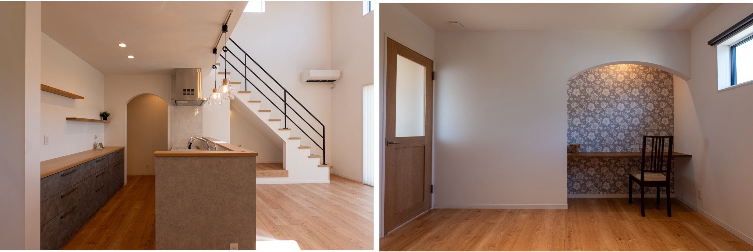 木の優しいインテリアに、アイアン×ガラス×真鍮のアクセントが相まって奥行のある空間に。ソフトで洗練された北欧テイストの雰囲気から感じる癒しと温もりは、アールの垂れ壁・ヌックの存在感が加わり、ご家族の生活を一層豊かに彩ります。どの部屋も統一感のあるこだわりのインテリアで、視線を送るたびに目が楽しみ、心が躍る上質なお住まいとなりました。