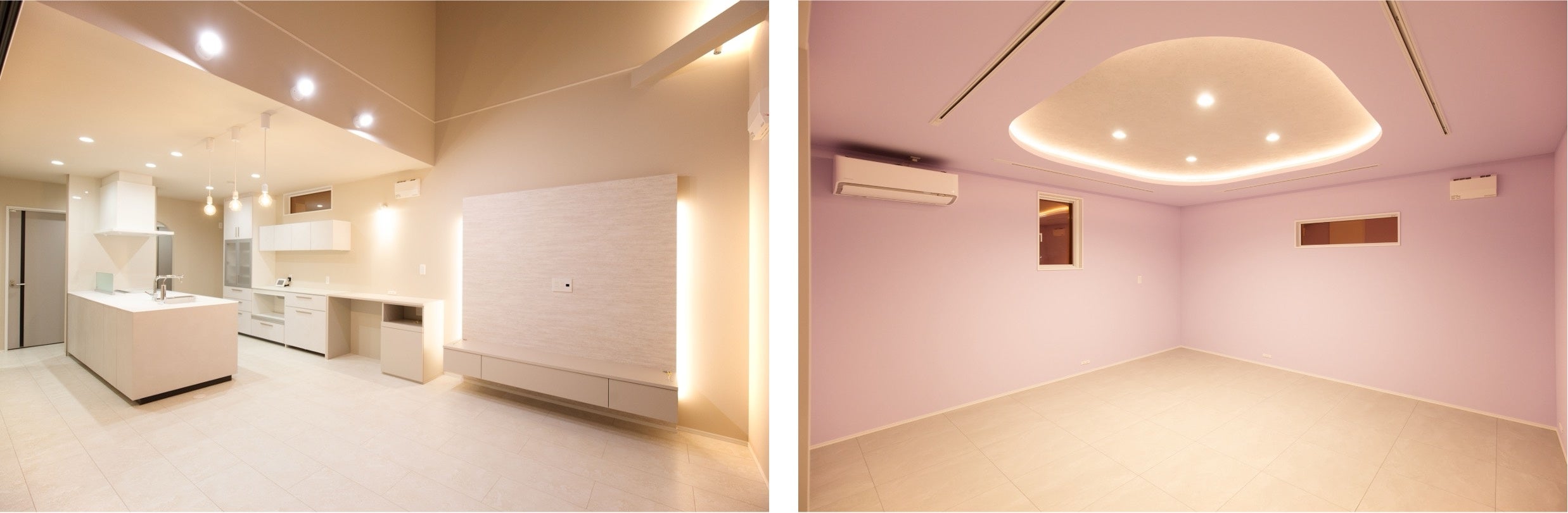 ホワイト色を基調とした高級感あふれるLDKスペース。無機質で冷たい印象を与えてしまいがちですが、LOW-Eブロンズ色のサッシと各所にアールを配置。間接照明を配置することで柔らかさと温かみのある空間となりました。機能性と室内の雰囲気に合わせて取付した造作家具もお施主様の細かい要望をかなえてくれるものとなりました。また2階の寝室スペースはその日の気分に合わせて照明を変化させる事ができるように配置。お施主様の気分を上げてくれるポップな内装ですが、くすみカラーを部分的に取り入れることにより子供っぽすぎず、大人らしい落ち着いた空間に仕上げています。