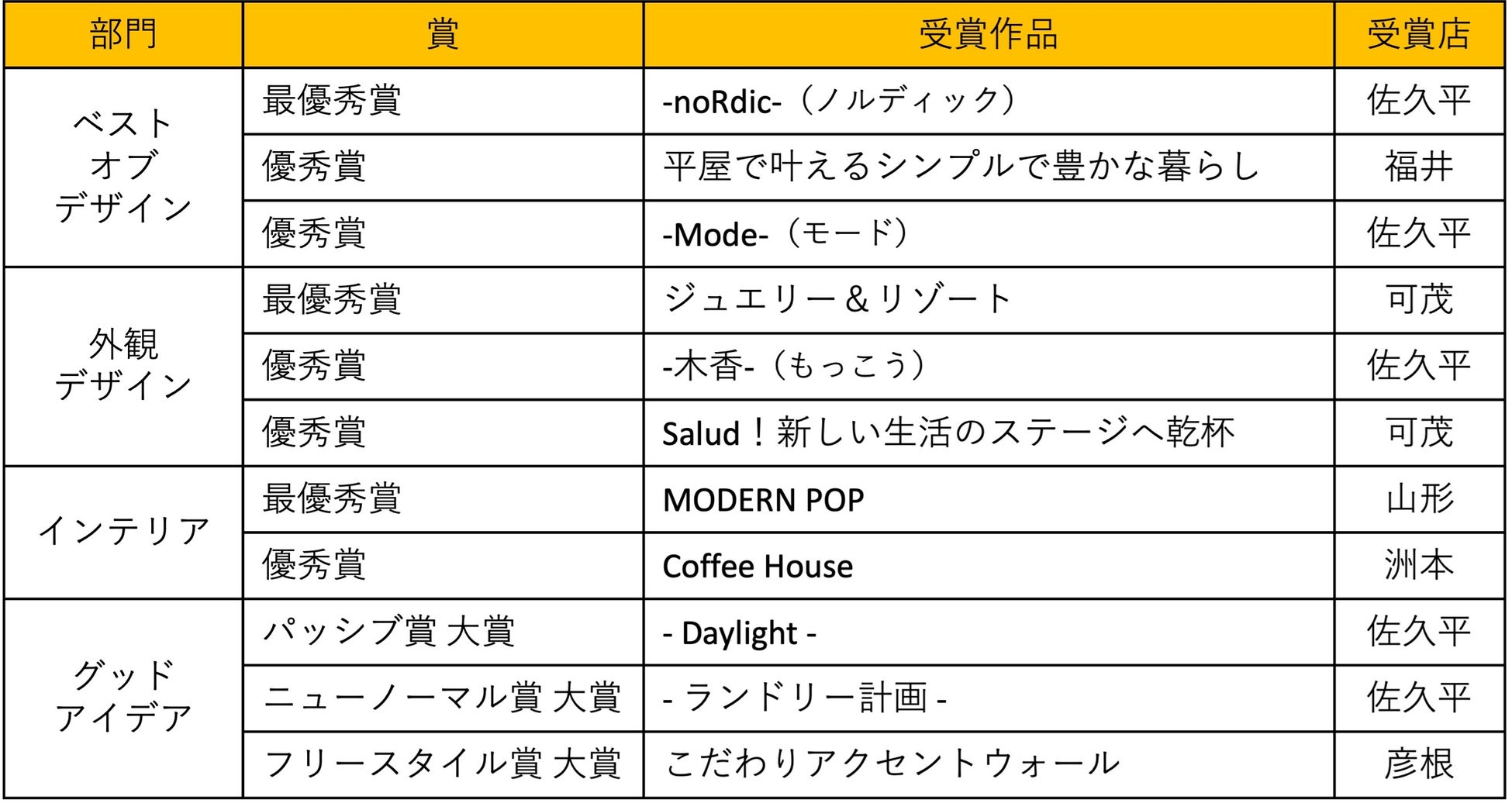 ・選考基準:フィアスホーム本部社員の投票により1次選考を実施。上位作品を加盟店による投票にて2次選考。1次・2次の得票数で最終選考を実施。ベストオブデザイン賞の選考にあたっては、断熱・気密、日射遮蔽、日射熱取得、通風利用、昼光利用のパッシブデザインの5要素の採用に立地条件を加味して決定