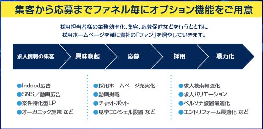 一般的な自社採用サイトに求められる「求人掲載」「コンテンツ掲載」等に加え、様々なアクセスアップ施策やオプション施策を実施でき、伴走型のサポートで運用と改善を支援します。
